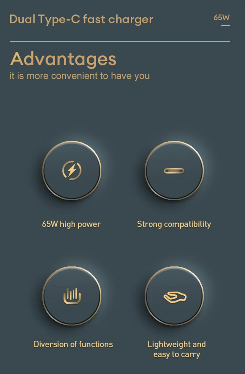 الشاحن يستخدم تقنية GaN اللي تعطيك شواحن قوية مع حجم عملي ومناسب.