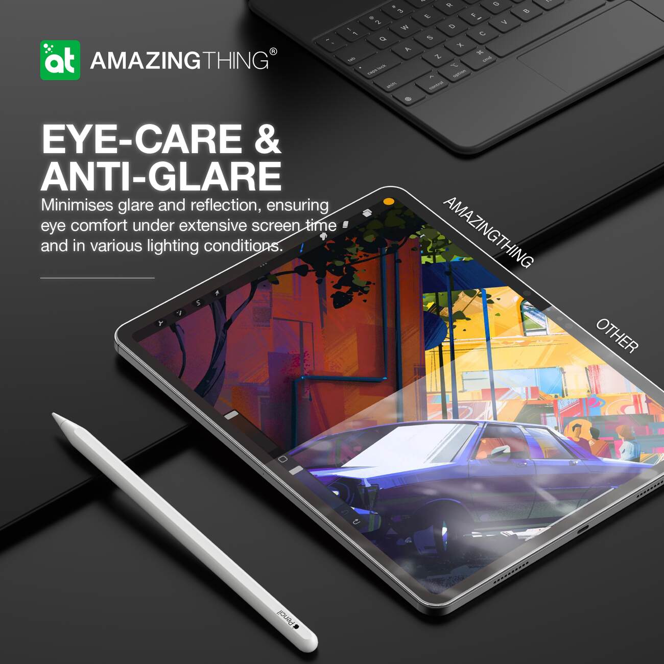 فيها طبقة اضافية مدمجة تحمي العين من الاشعة الزرقاء الضارة اللي تتعرض لها بشكل متواصل من شاشة الايباد.