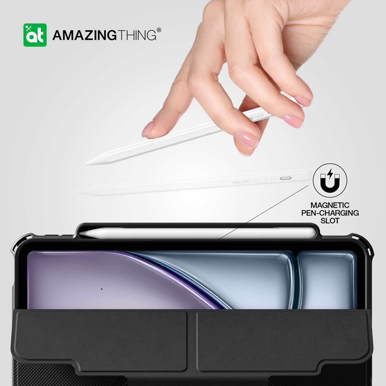 يحتوي على مكان لحفظ وشحن قلم ابل مغناطيسياً .. بالتالي يمنع ضياعه.