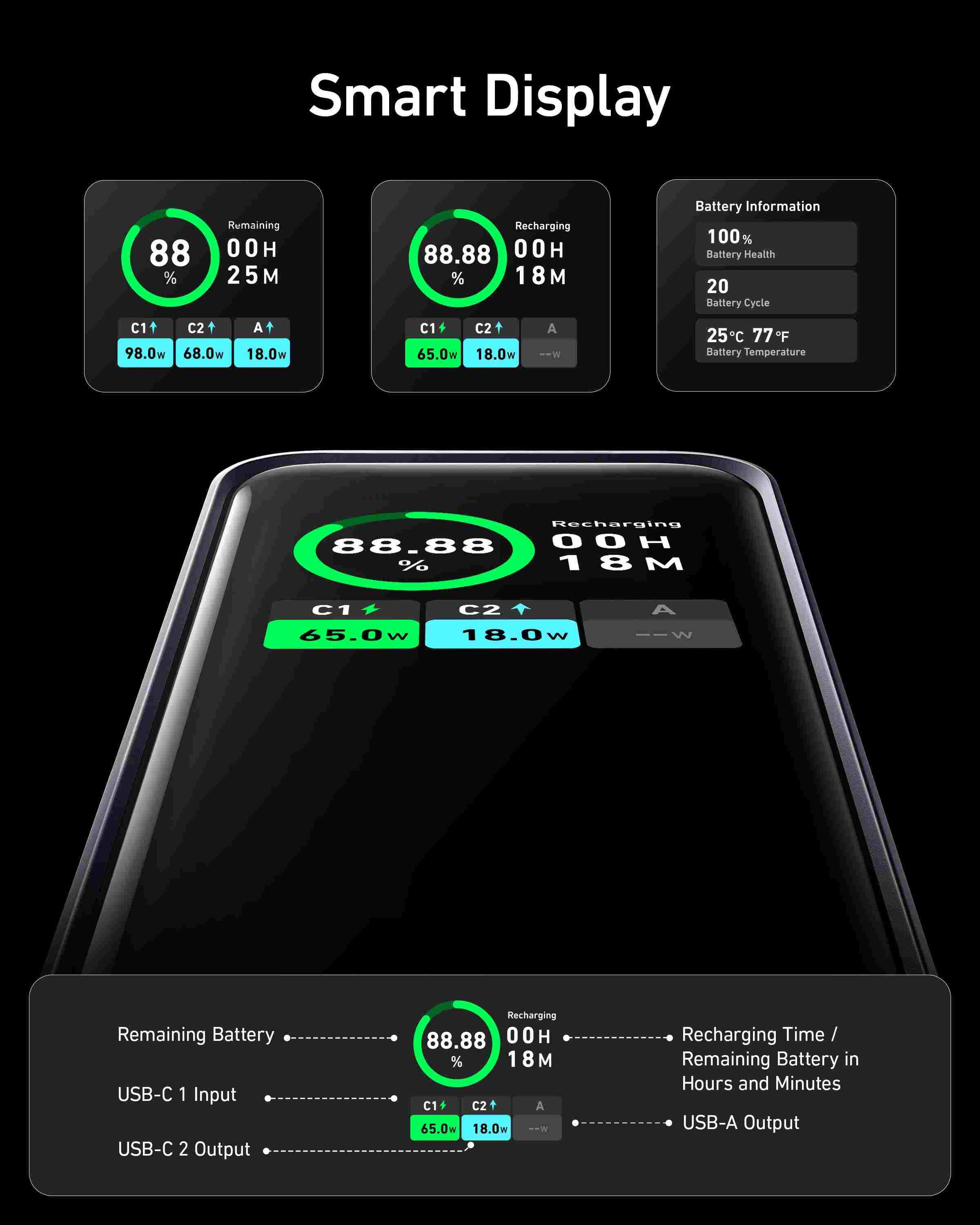 بطارية انكر برايم 20 الف mAh / مدخلين تايب سي + مدخل USB / شاشة مدمجة / شحن سريع 200 واط