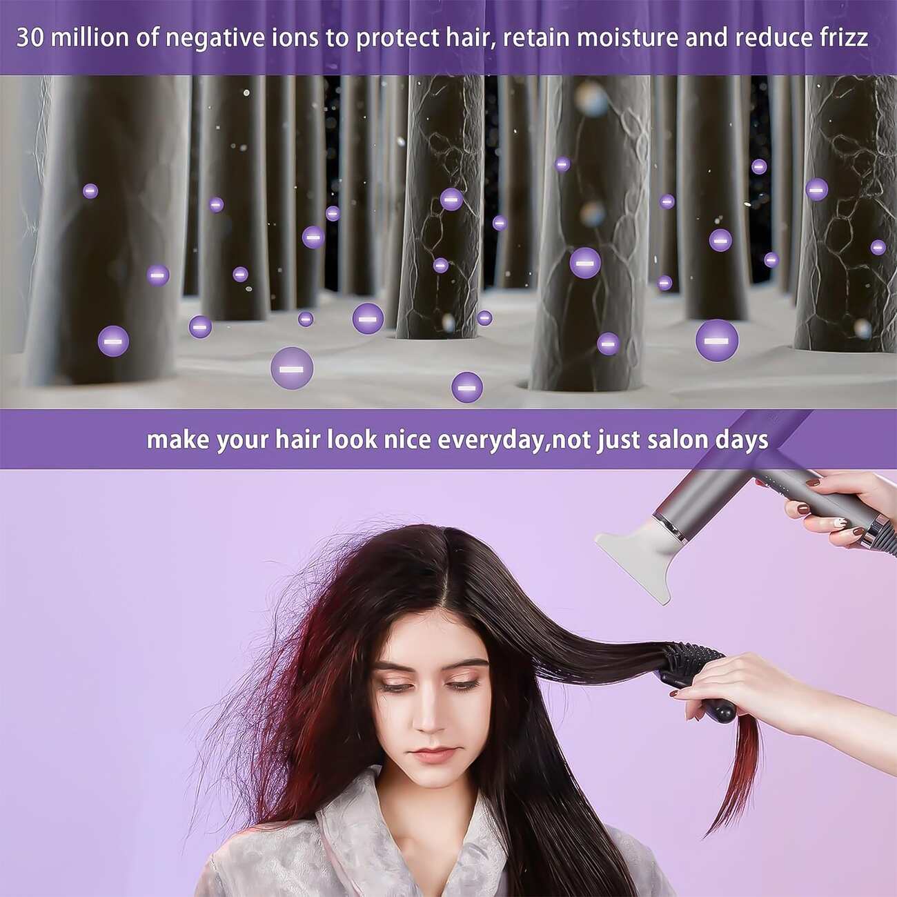 توليد الأيونات: ينبعث منه ايونات سالبة لتقليل التجعد وتنعيم الشعر.