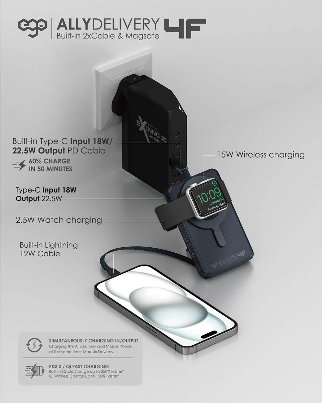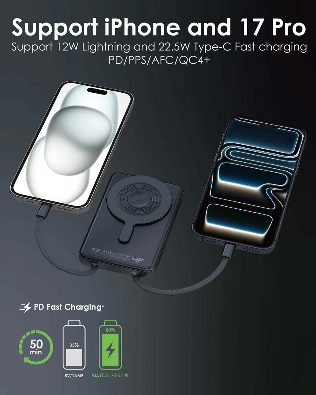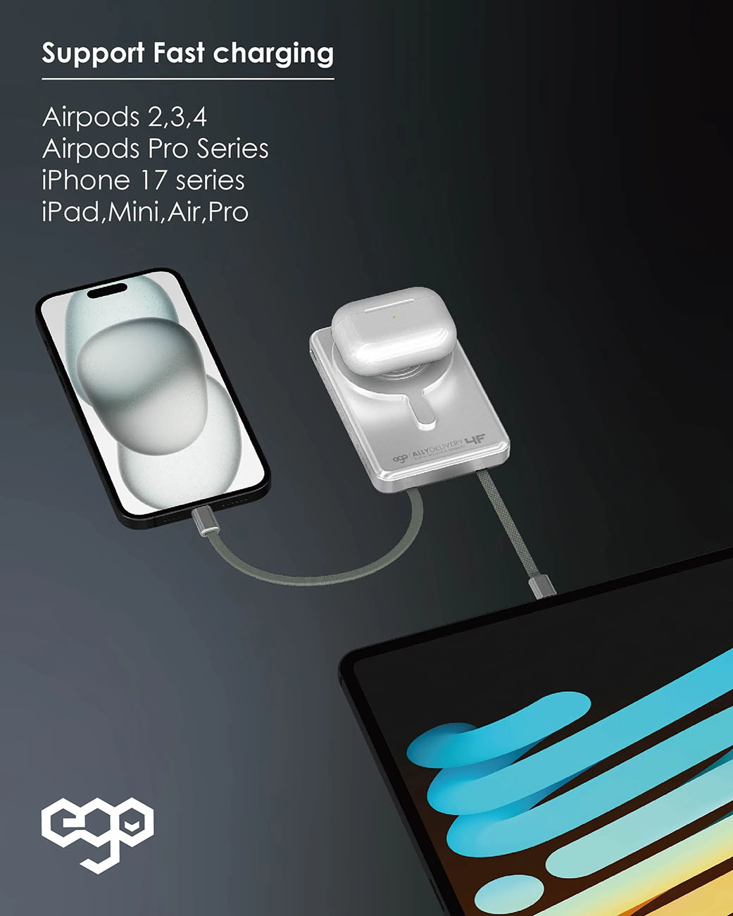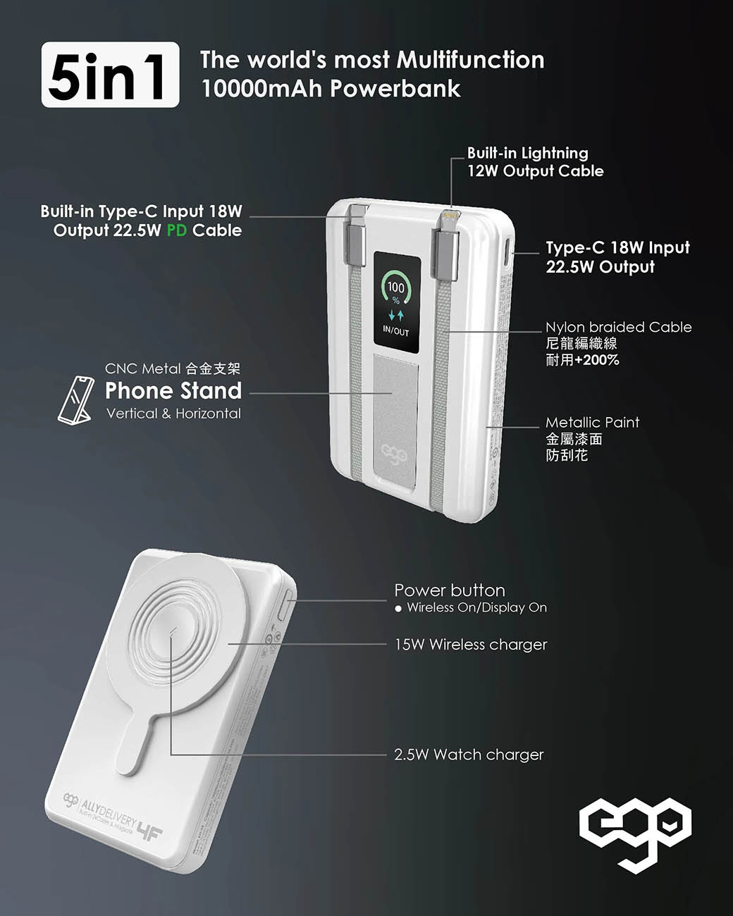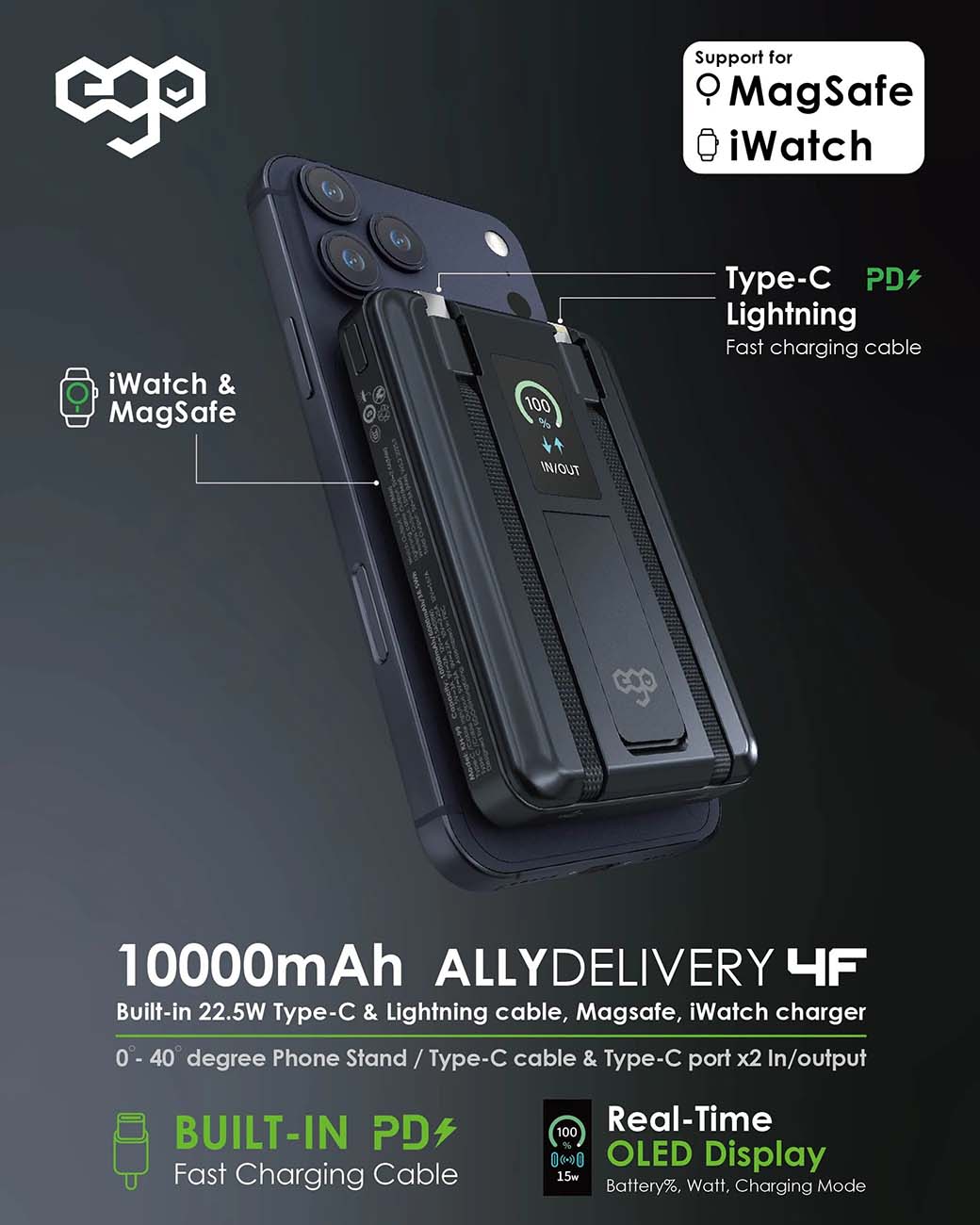 بطارية ego AllyDelivery / سعة 10000mAh / واير تايب سي + Lighting مدمج / ستاند + شحن لاسلكي / اسود