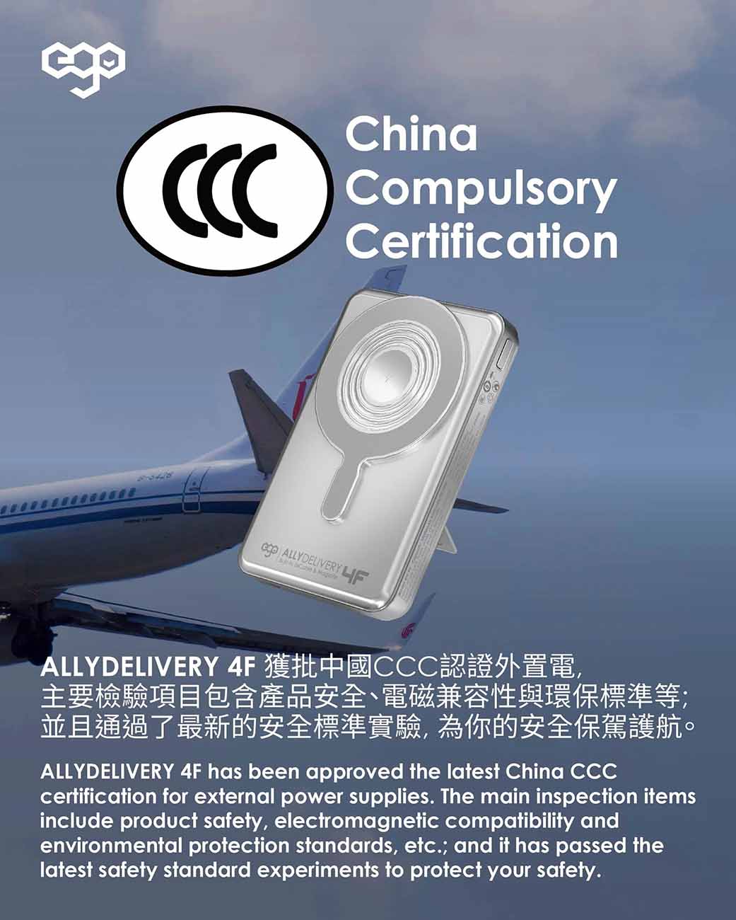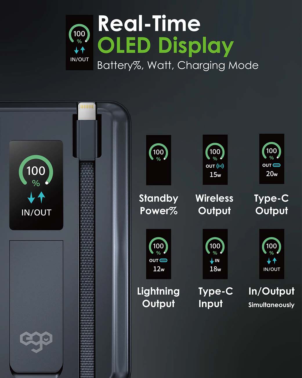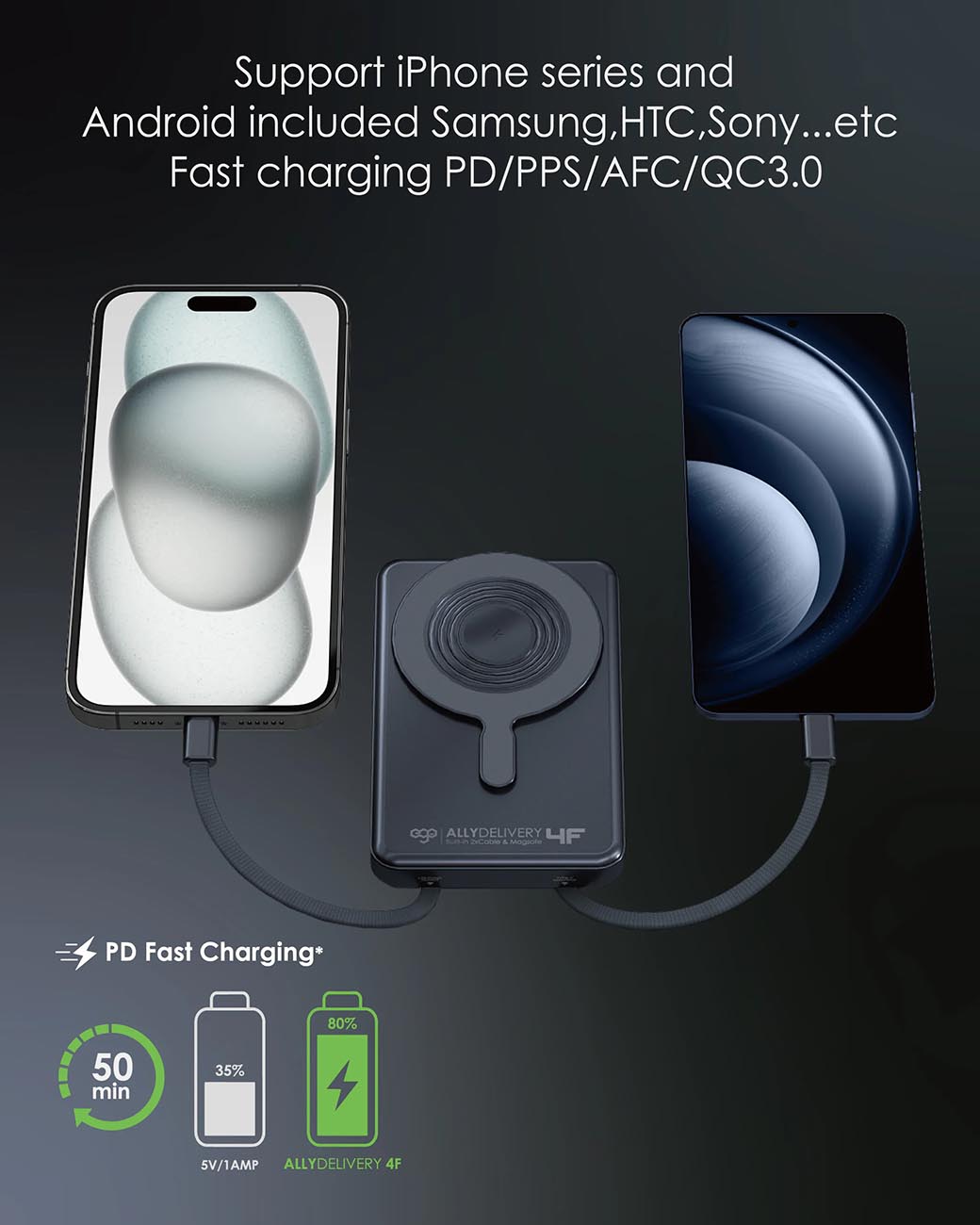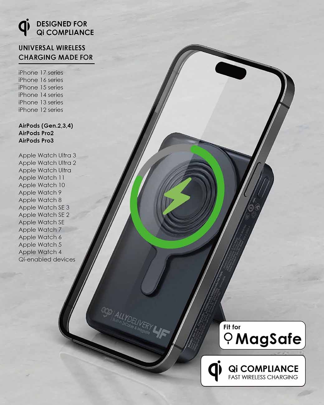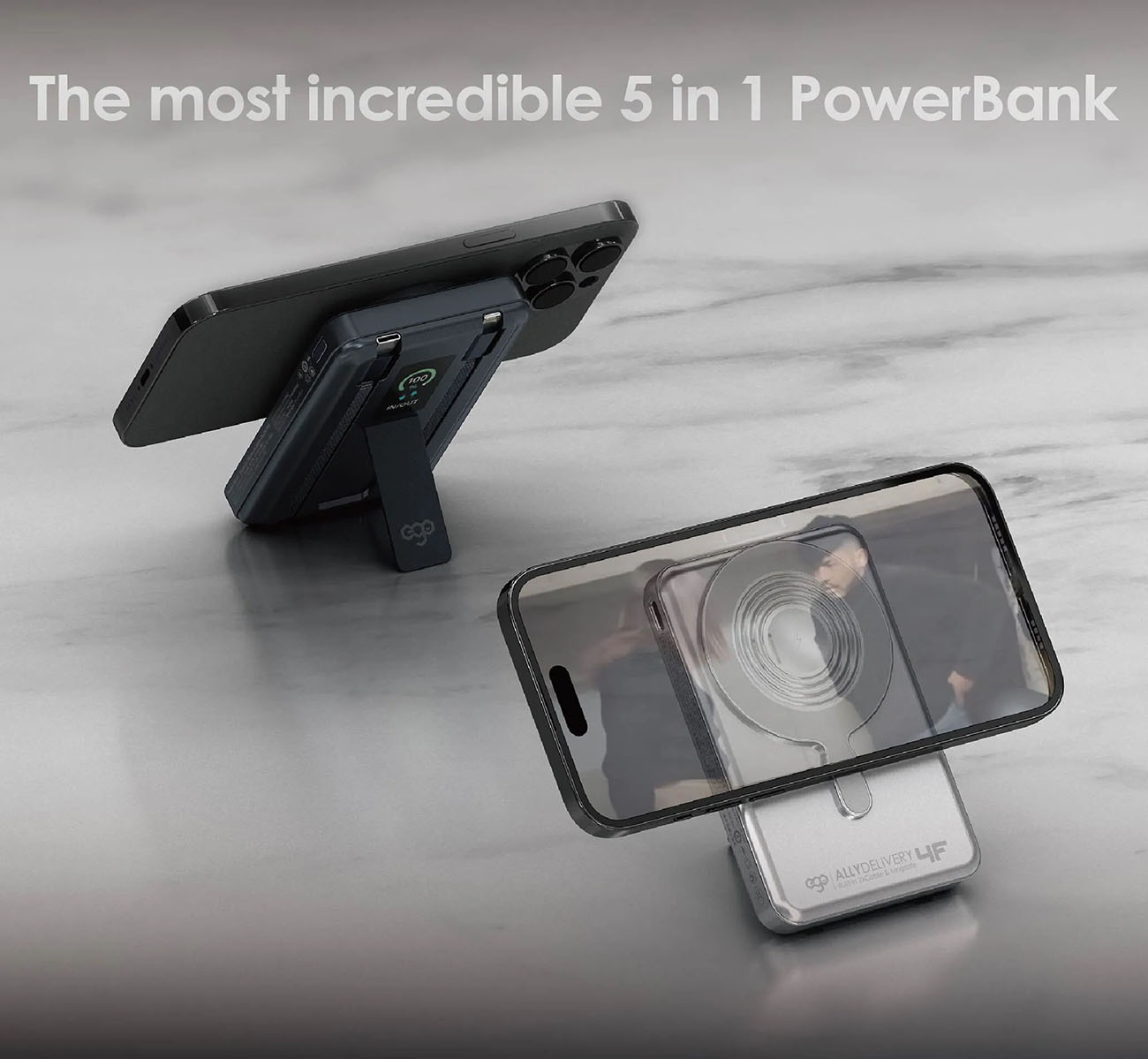 بطارية ego AllyDelivery / سعة 10000mAh / واير تايب سي + Lighting مدمج / ستاند + شحن لاسلكي / اسود