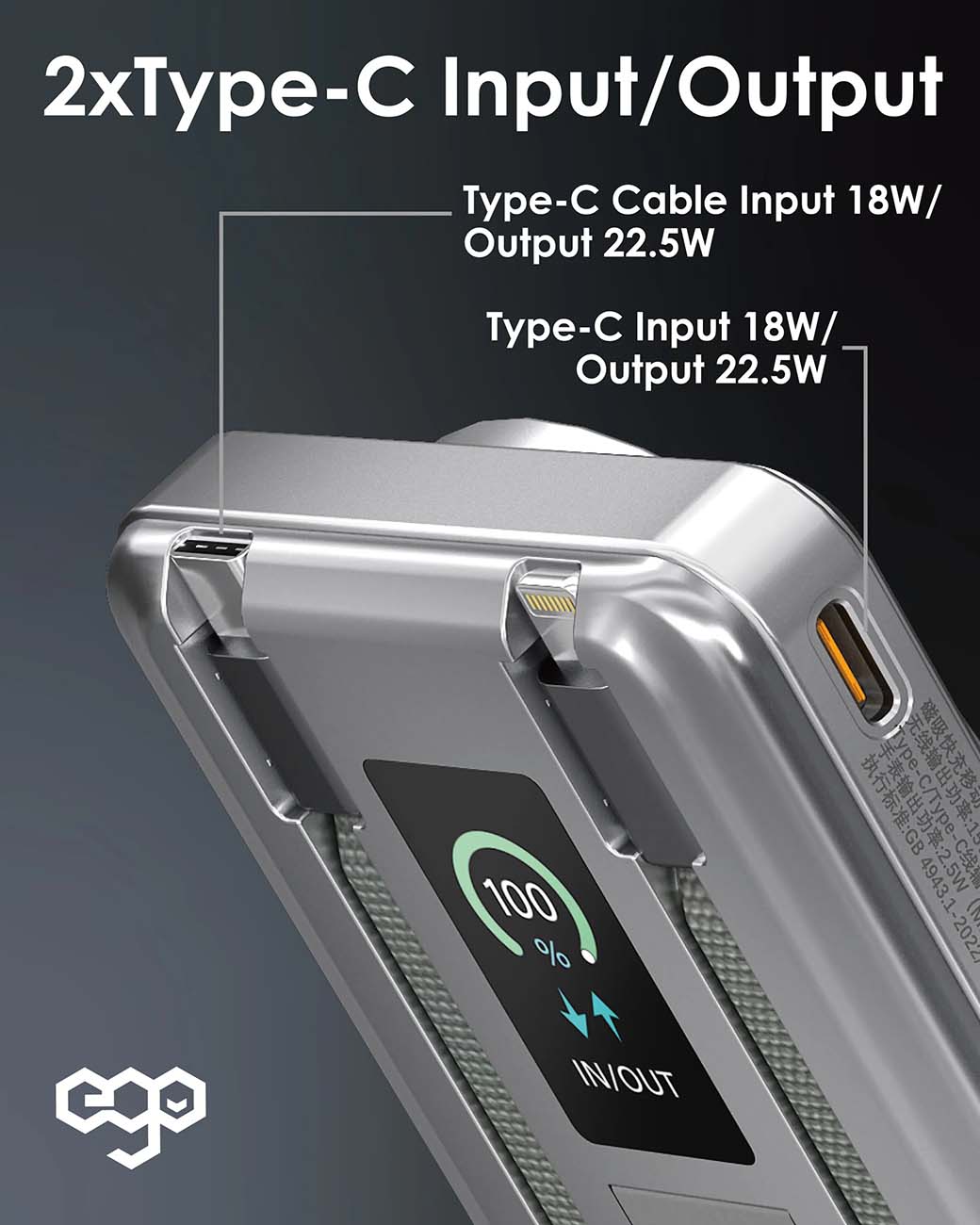 بطارية ego Allyslim2 المغناطيسية / سعة 10 الاف mAh / مع واير تايب سي + Lightning مدمج / تيتانيوم