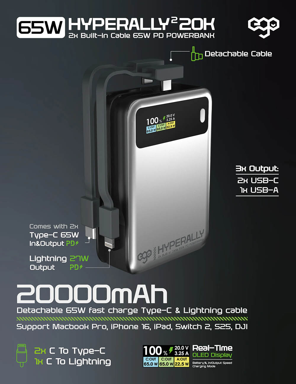 بطارية ego AllyDelivery / سعة 10000mAh / واير تايب سي + Lighting مدمج / ستاند + شحن لاسلكي / رصاصي