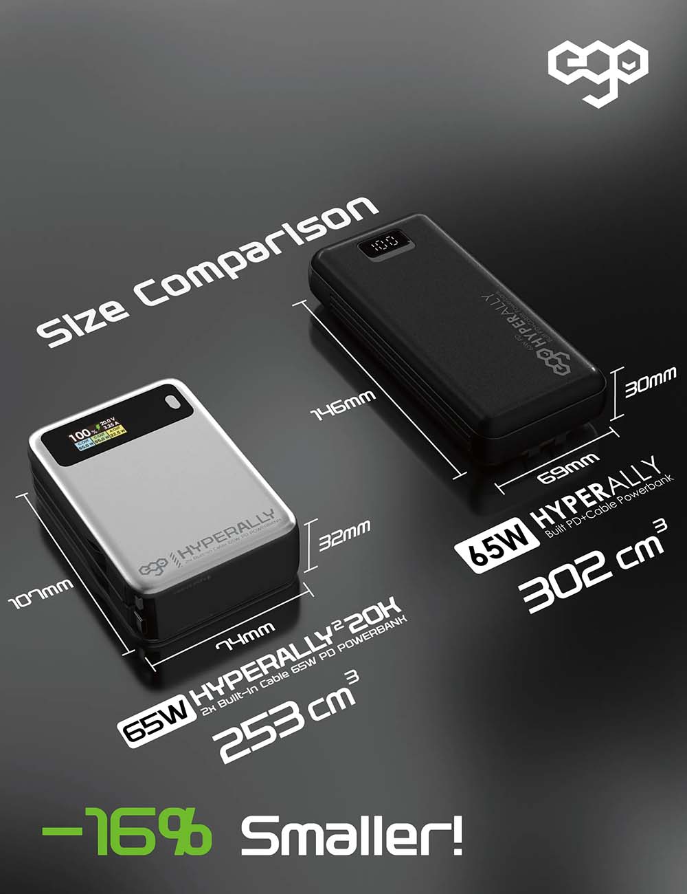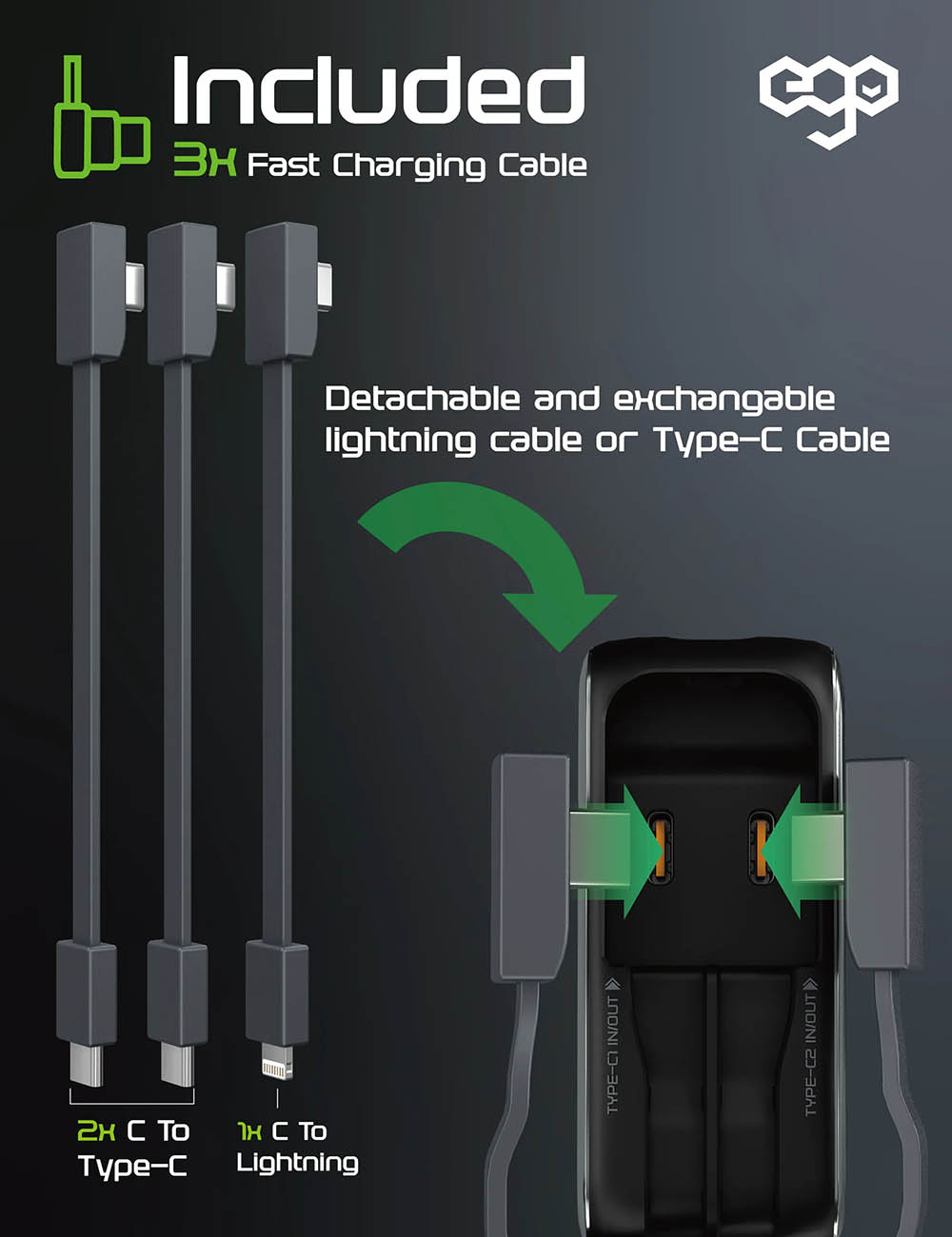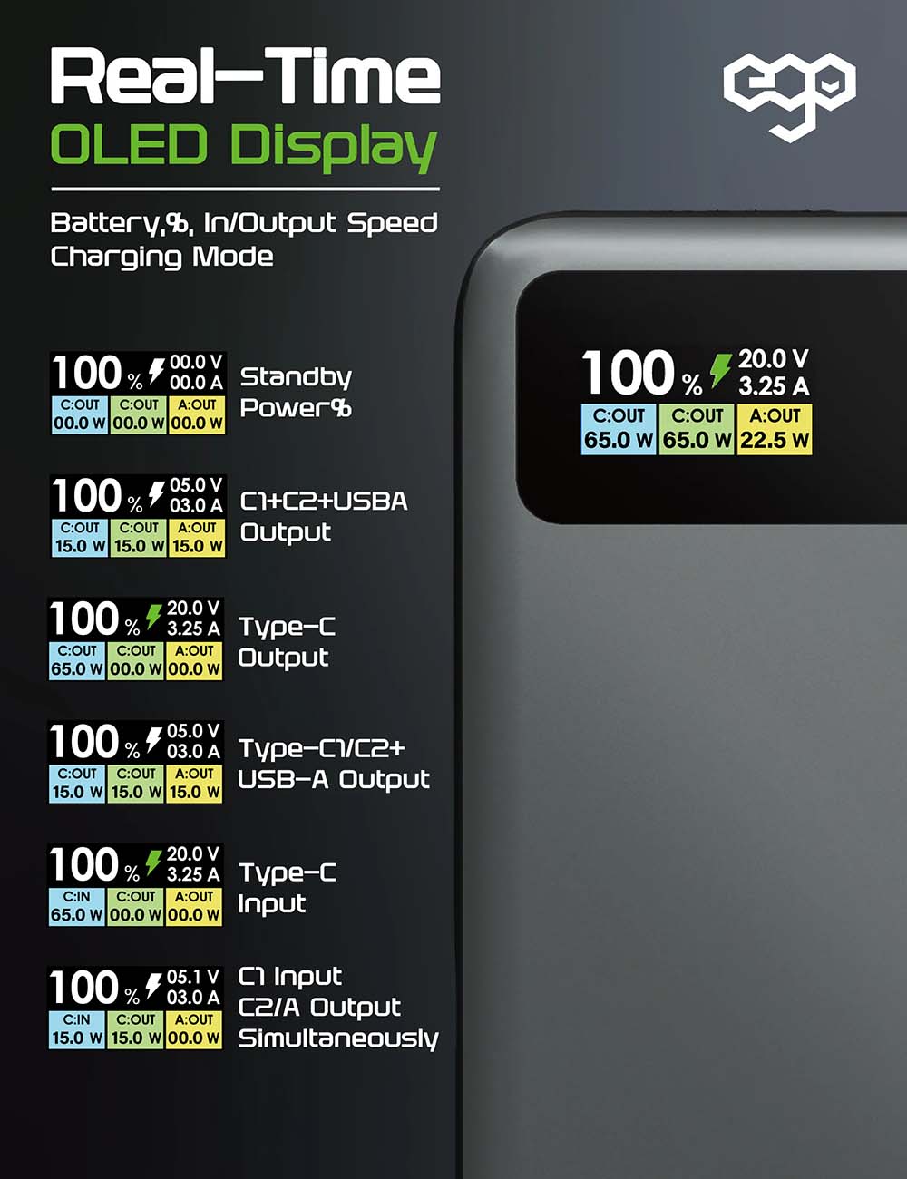 بلك من ego / مع 2 مداخل تايب سي / قوة 65 واط / قابل للطي / اسود