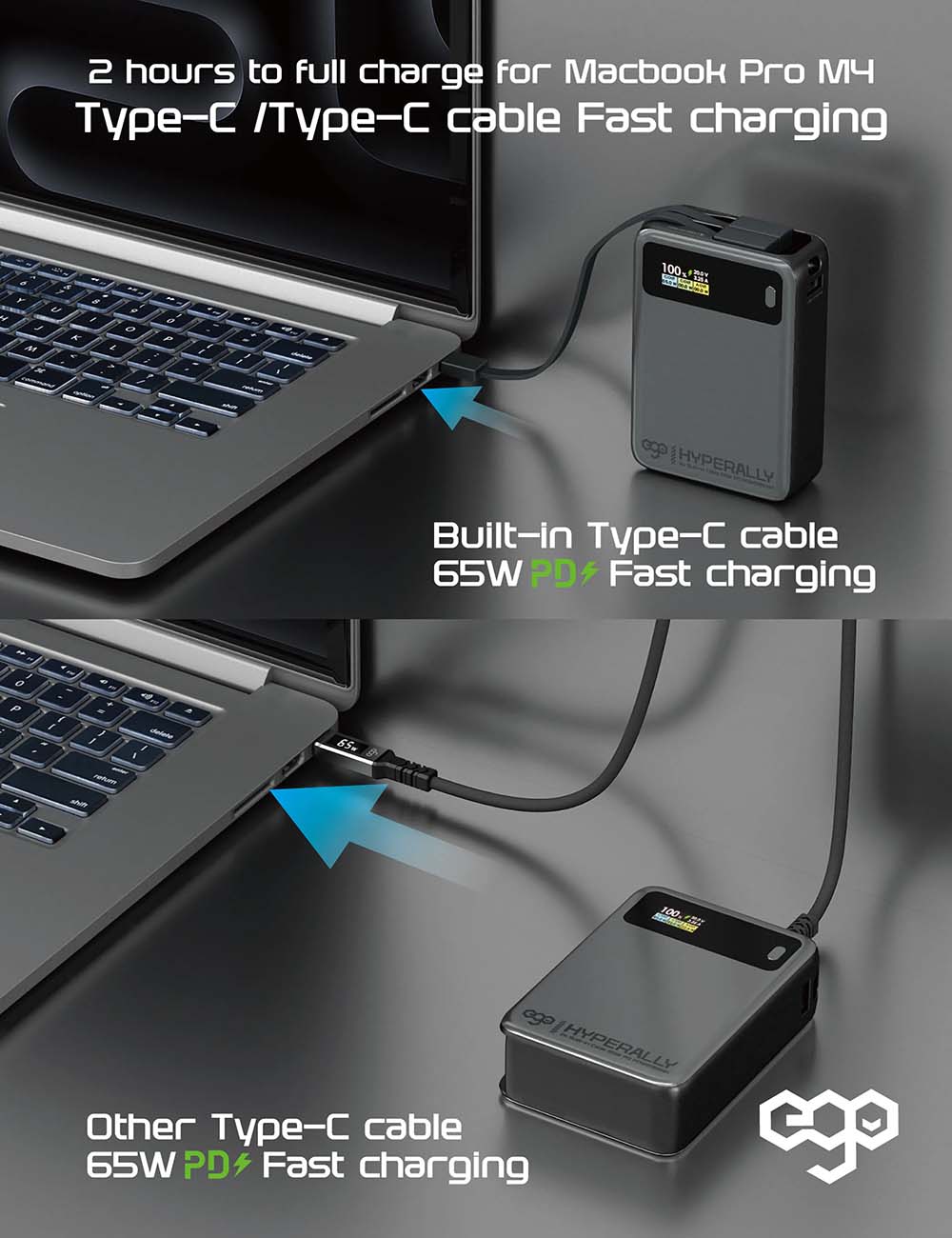 واير ego المغناطيسي / نوع تايب سي الى تايب سي / شحن سريع / قوة 240 واط / مع شاشة مدمجة / طول 0.5 متر
