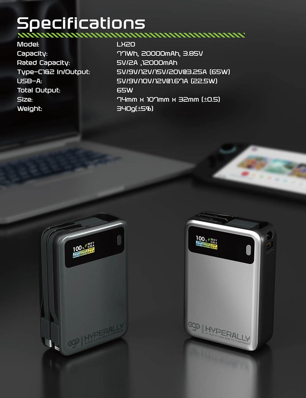 بطارية سعة 20 الف mAh من Goui / مع مدخلين تايب سي و مدخل USB / قوة 65 واط