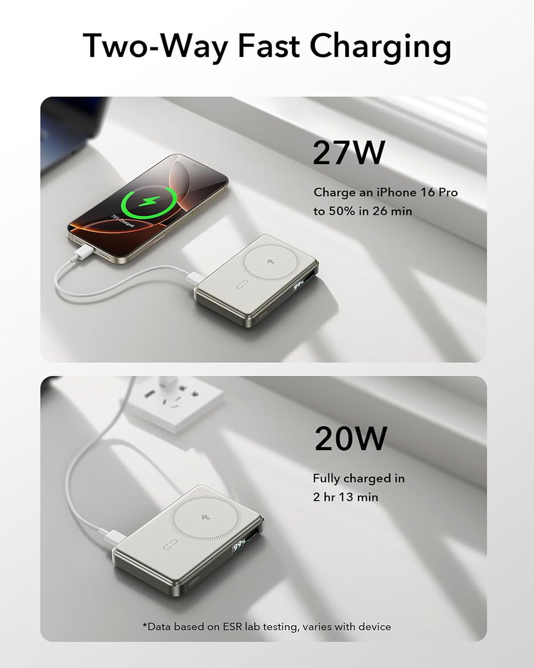 بطارية ESR Qi2 المغناطيسية / سعة 10 الاف mAh / قوة 15 واط / مع مدخل تايب سي قوة 27 واط / اسود