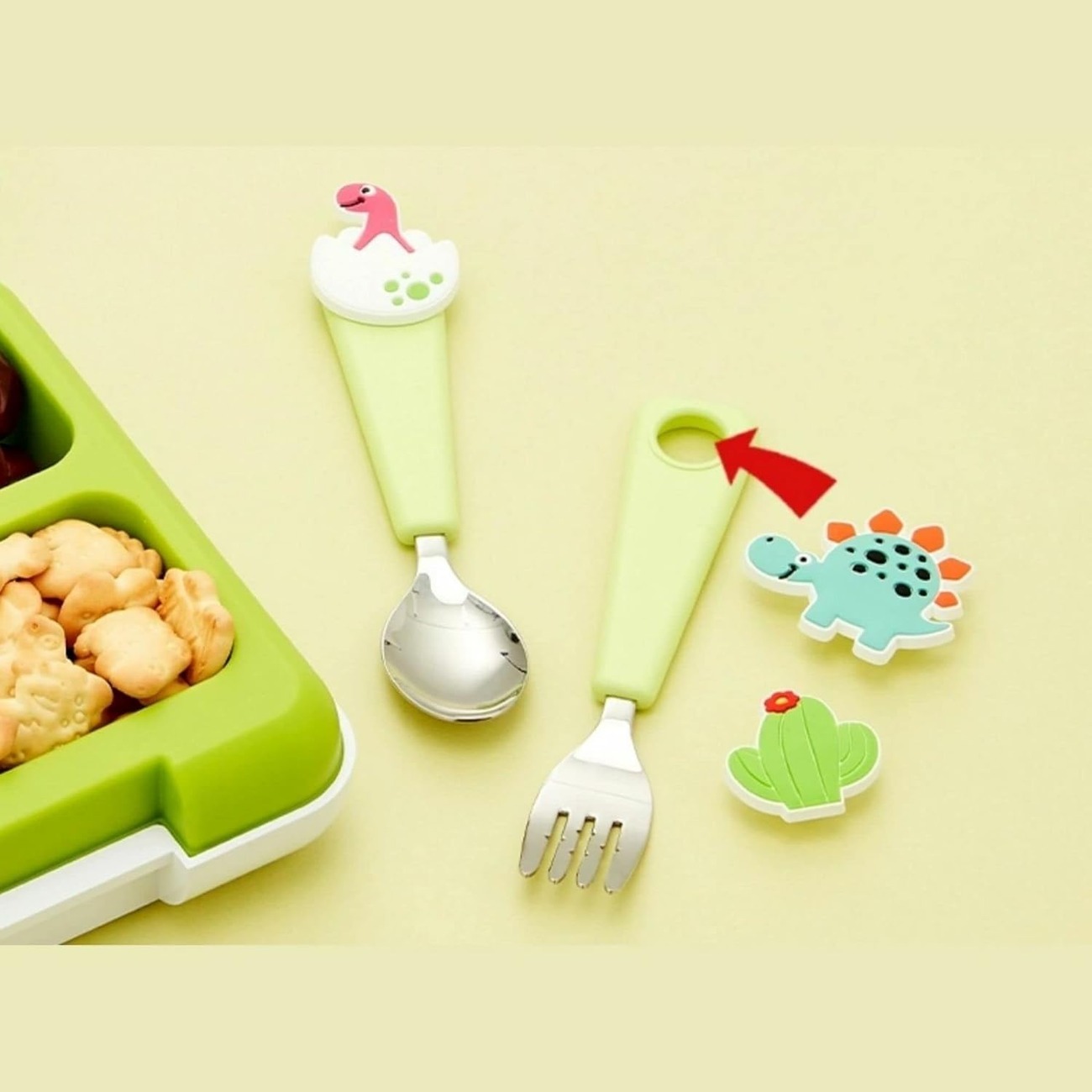 تقدر تستخدم بروشات FlexCharm لتزيين الملعقة والشوكة وبالتالي تحمس طفلك للاكل.