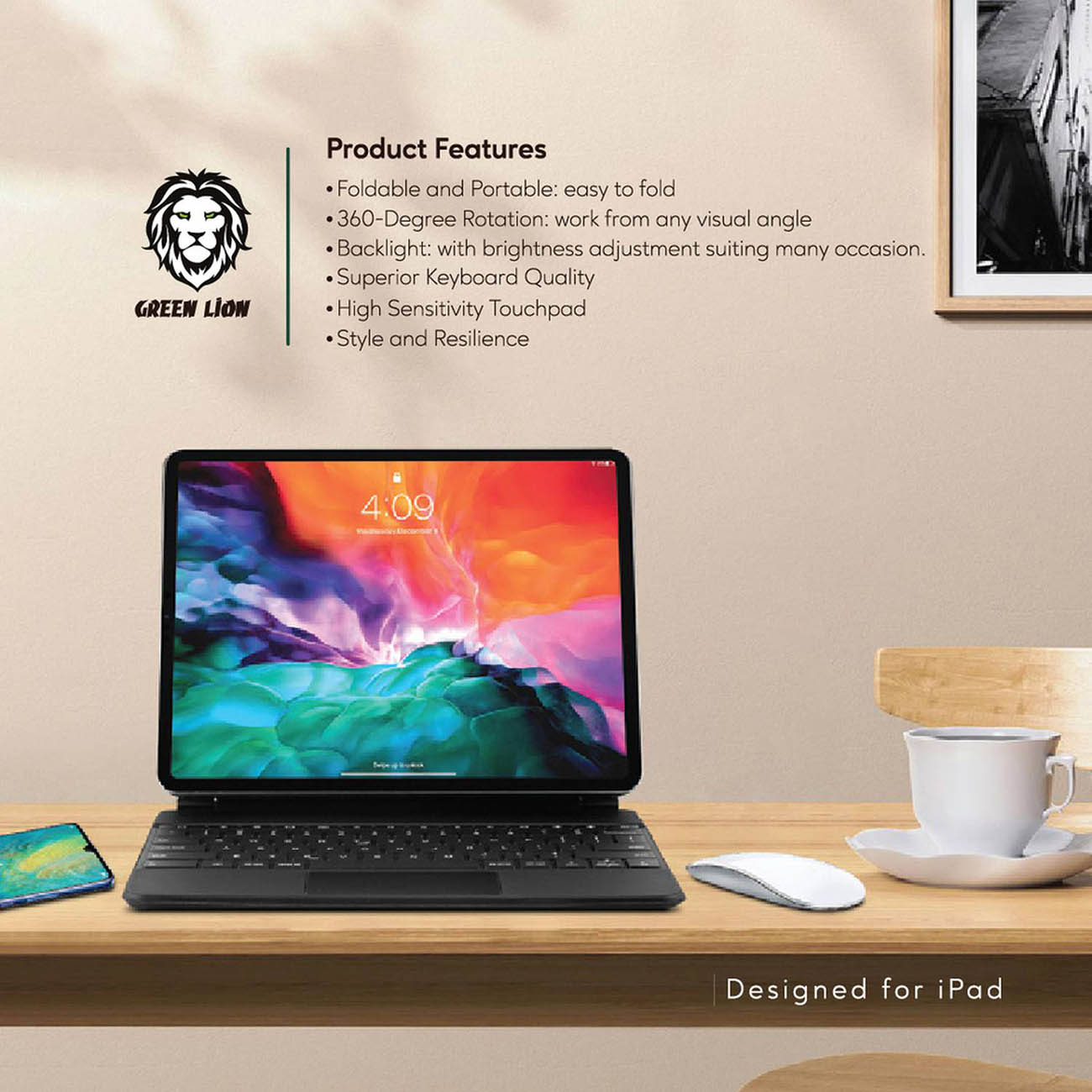 تصميم عملي ، يسمح بالدوران بزاوية 360 درجة لاستخدام الايباد للكتابة أو مشاهدة المسلسلات والفيديوات