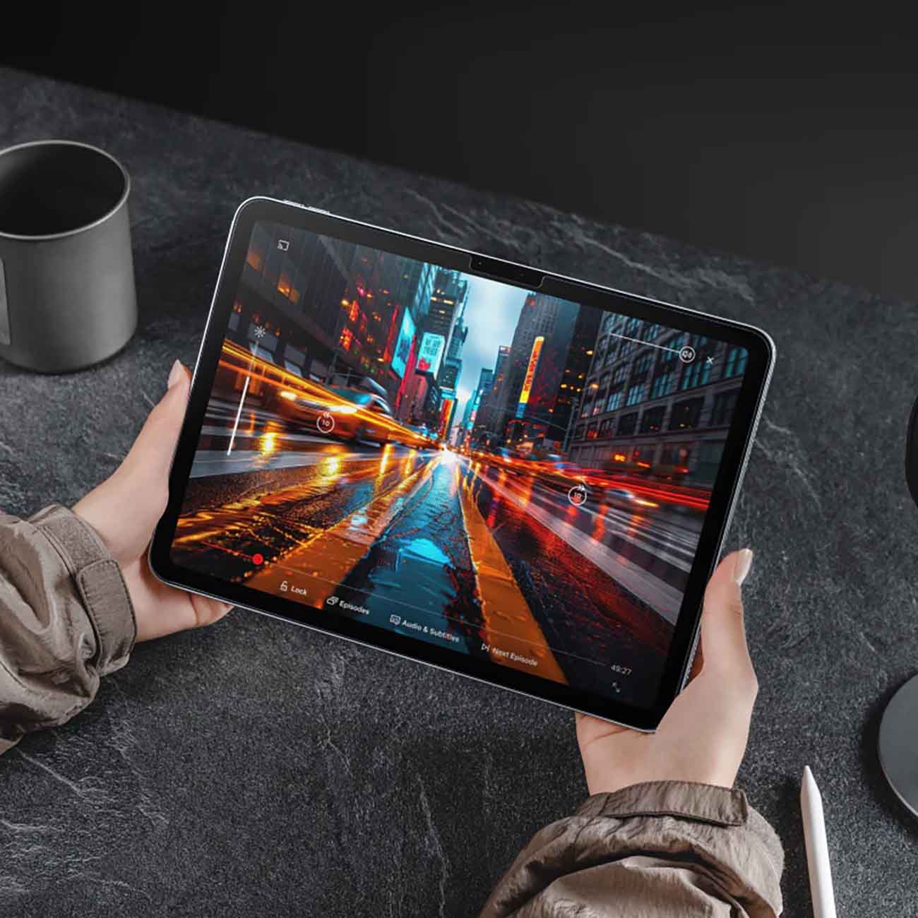 فيها تقنية مضادة للضوء الأزرق تحمي العين من الاشعة الزرقاء الضارة اللي تتعرض لها بشكل متواصل من شاشة الايباد.