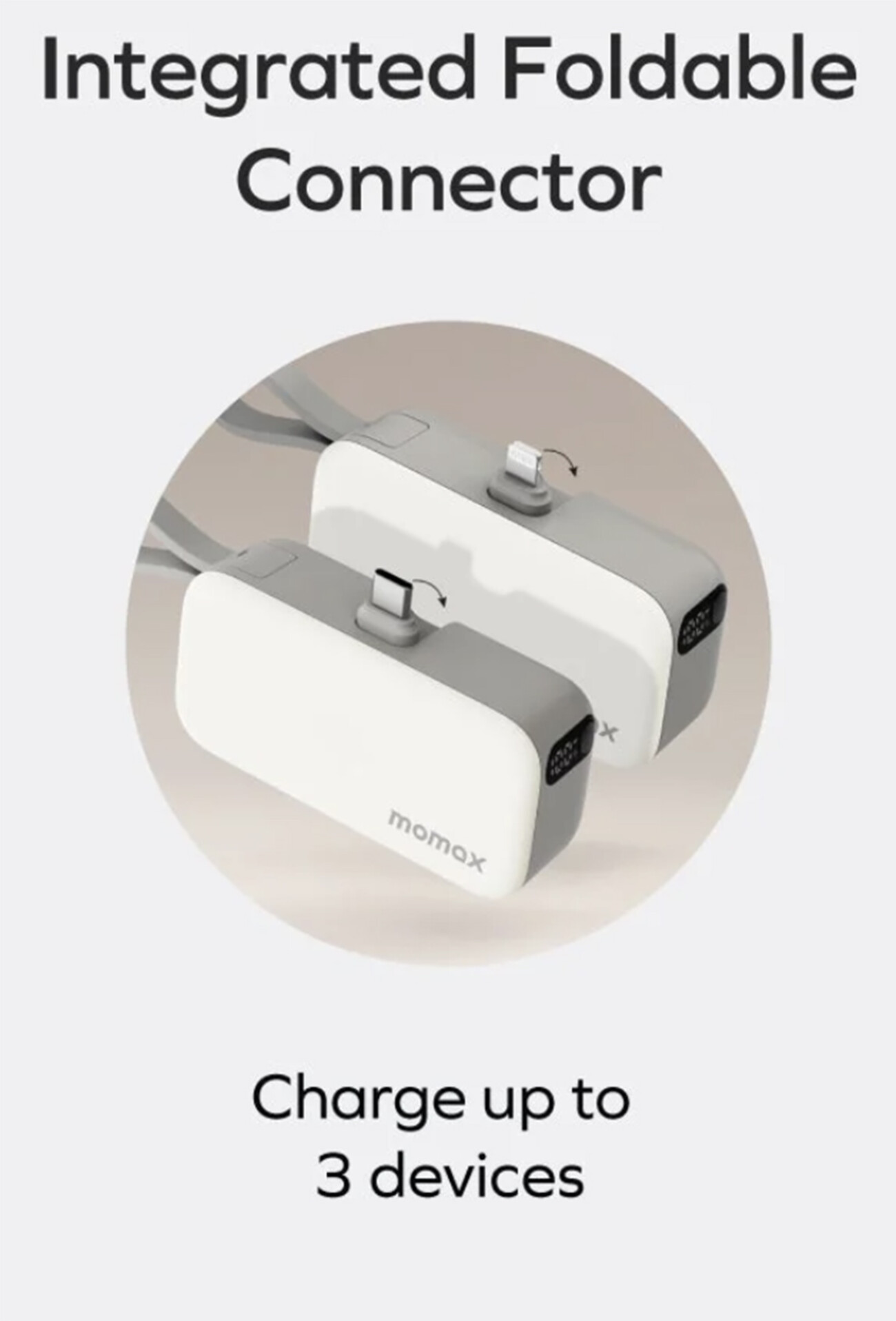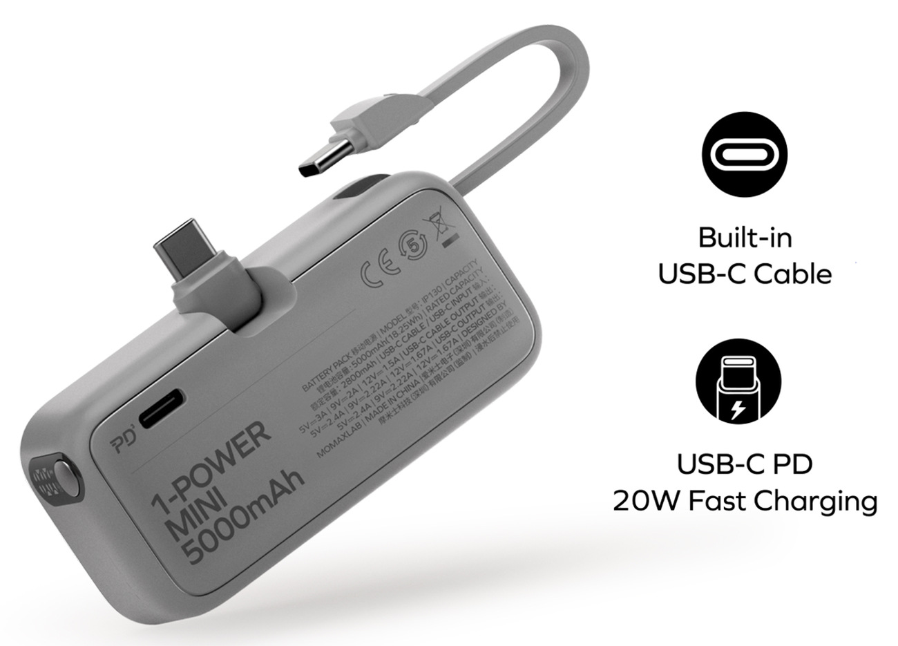 بطارية Momax Power / سعة 5 الاف mAh / مع مدخل Lightning + واير تايب سي مدمج / حجم ميني