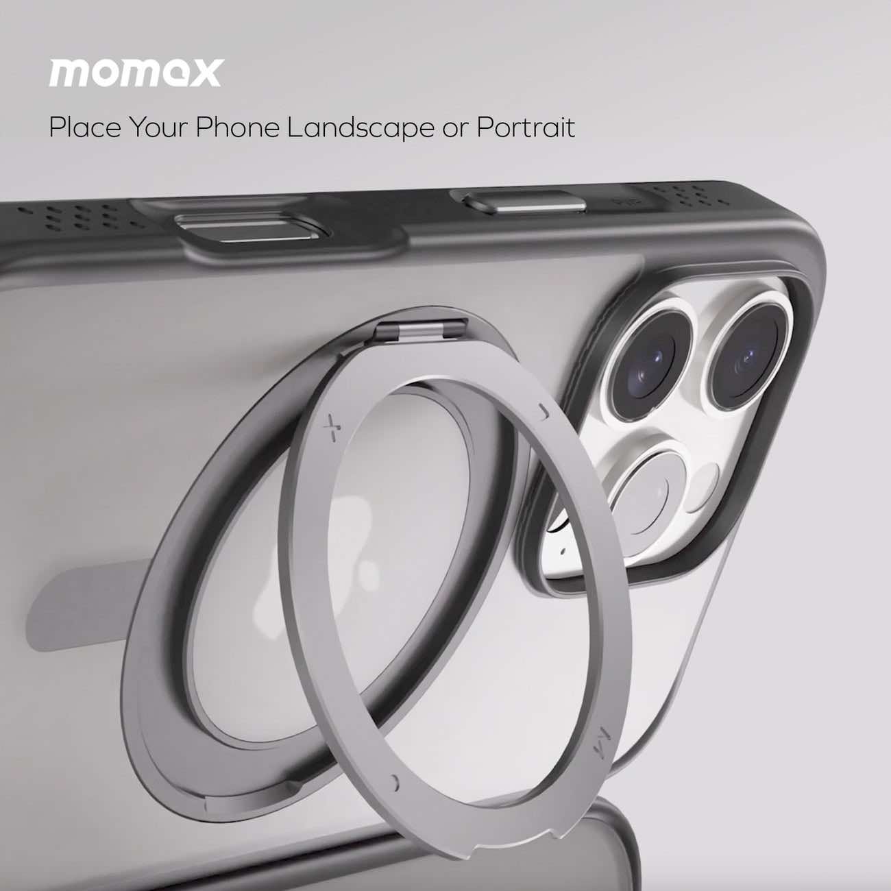 كفر Momax Roller لايفون 16 برو / ستاند و مسكة مدمجة / يدعم MagSafe / ضد الطيحات / رمادي