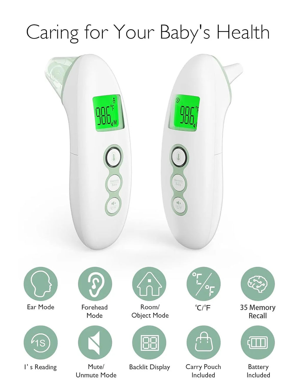 يقيس درجة حرارة الجبهة .. الأذن .. الجسم .. السوائل مثل الحليب والماء .. ودرجة حرارة الغرفة.