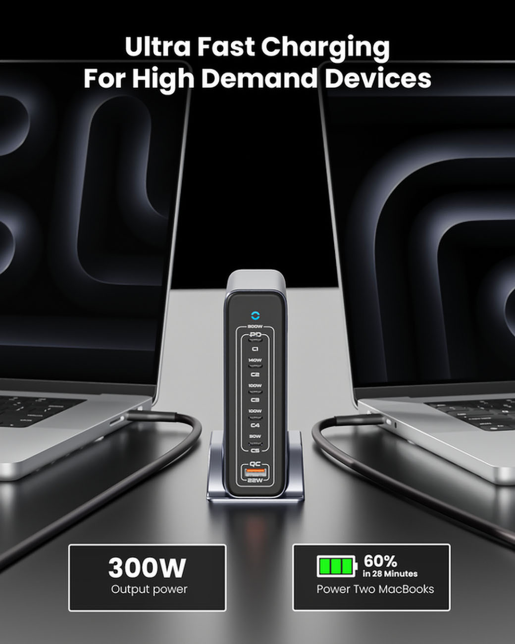 شاحن GaN من urtech / قوة 200 واط / 3 مداخل تايب سي + مدخلين USB / شاشة LED ذكية