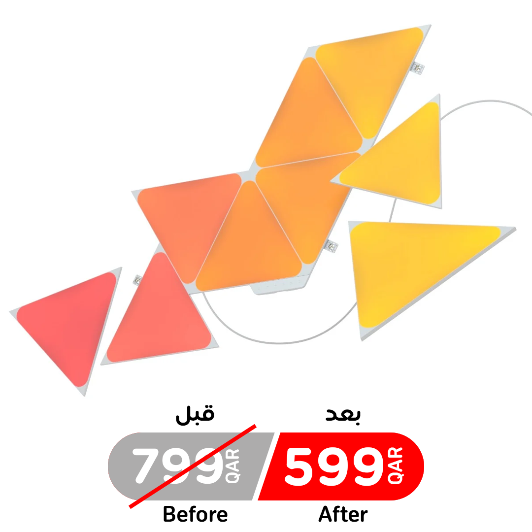 طقم كامل من مصابيح اورورا الذكية يحتوي على 9 قطع شكل مثلث بالاضافة الى القطع التي تلصق الاضاءة بالحائط ومحول كهرباء.