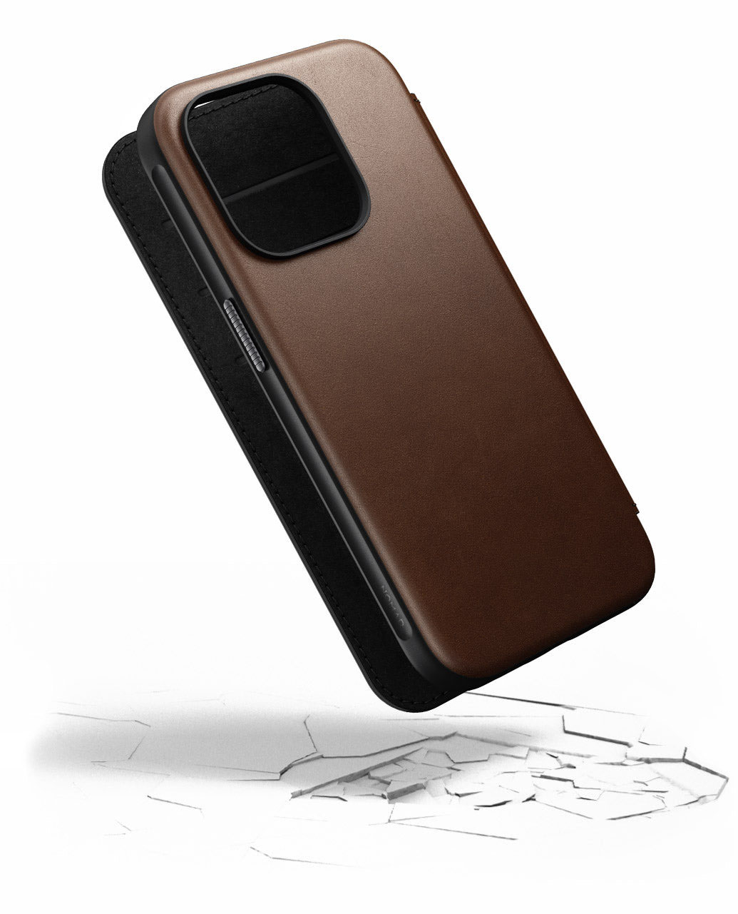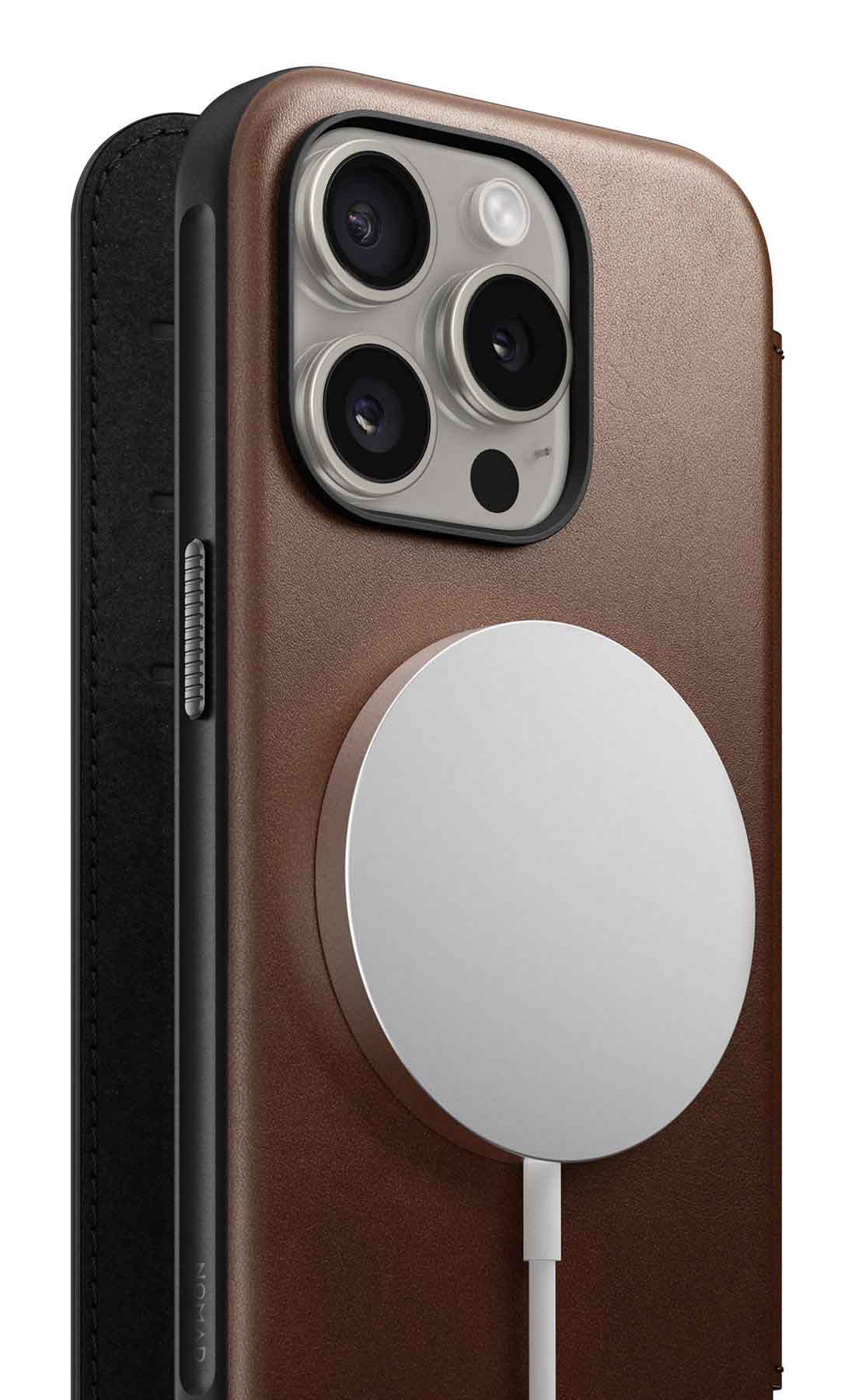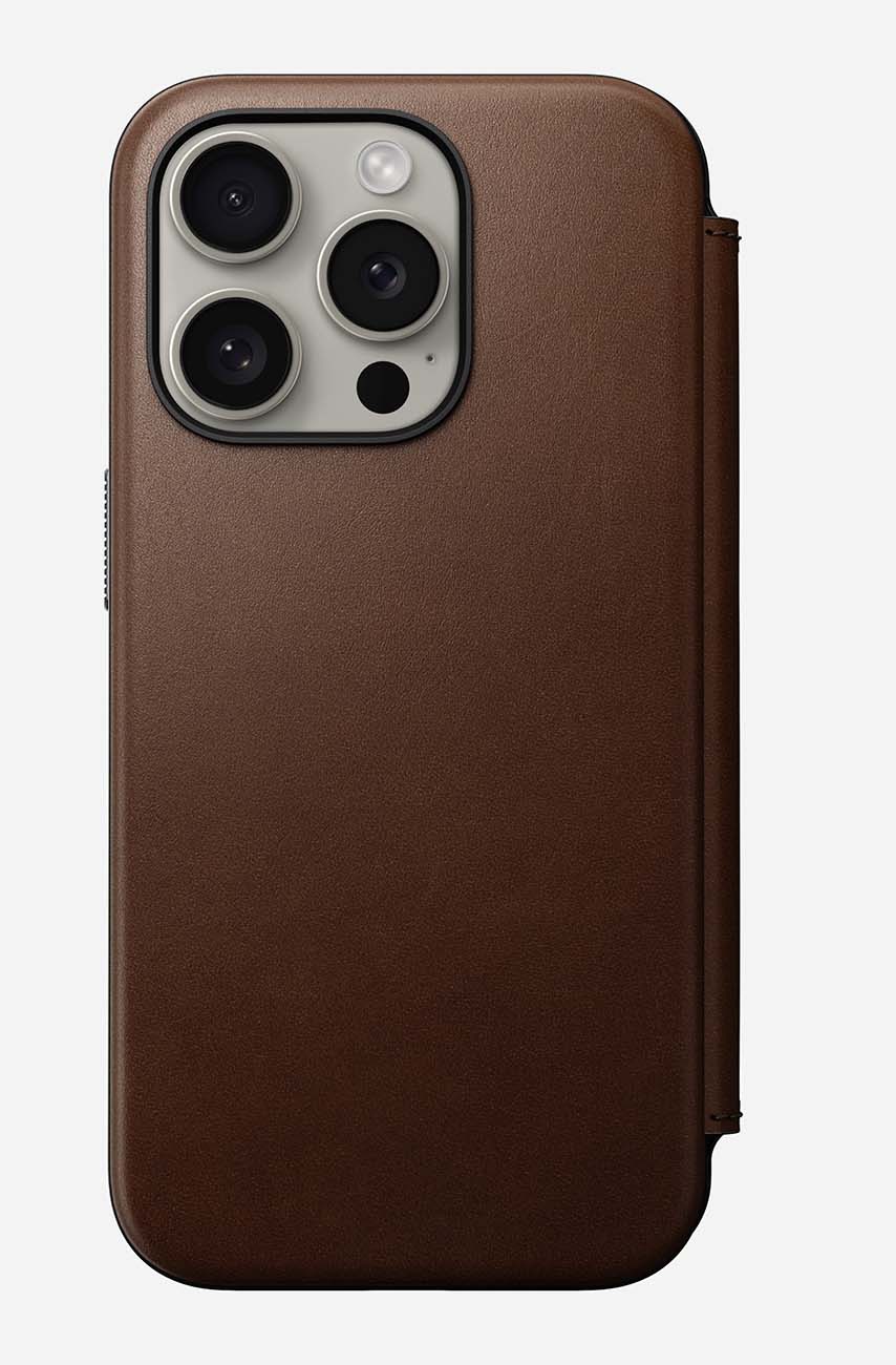 كفر Nomad Leather Folio لايفون 15 برو / بوك مدمج / يغطي الشاشة / يدعم MagSafe / جلد بني