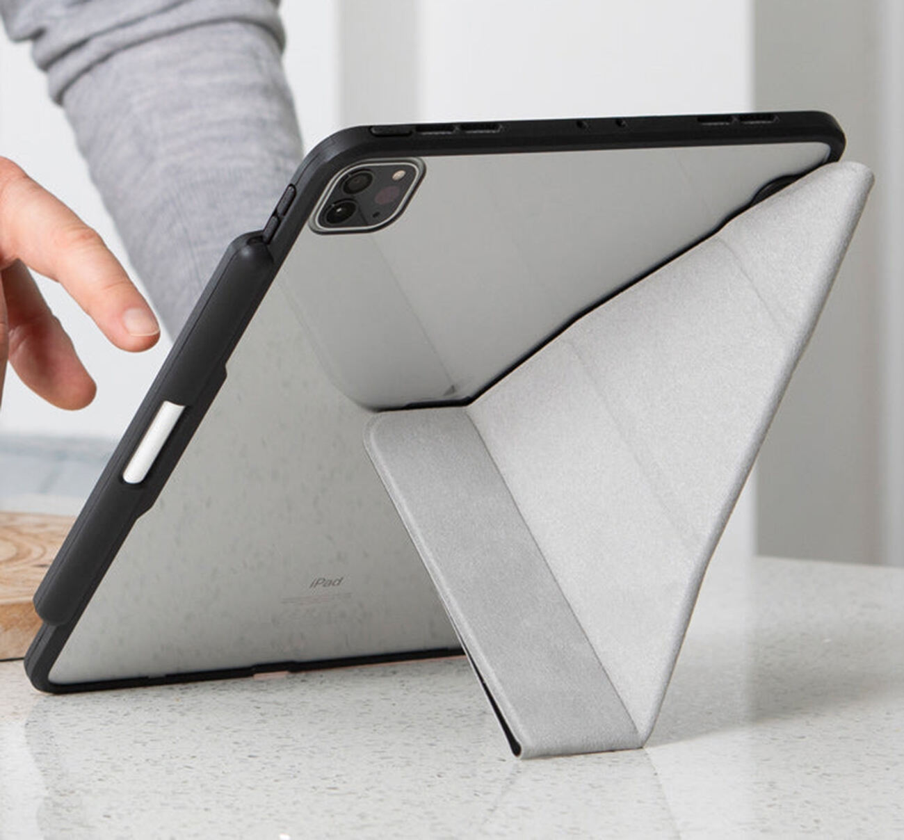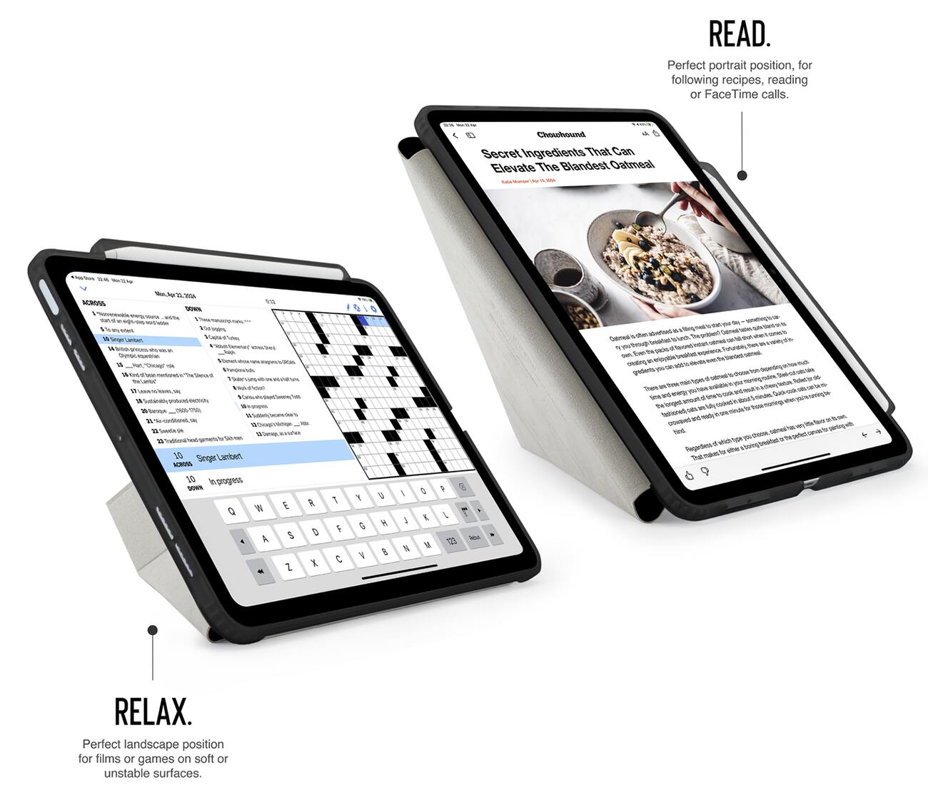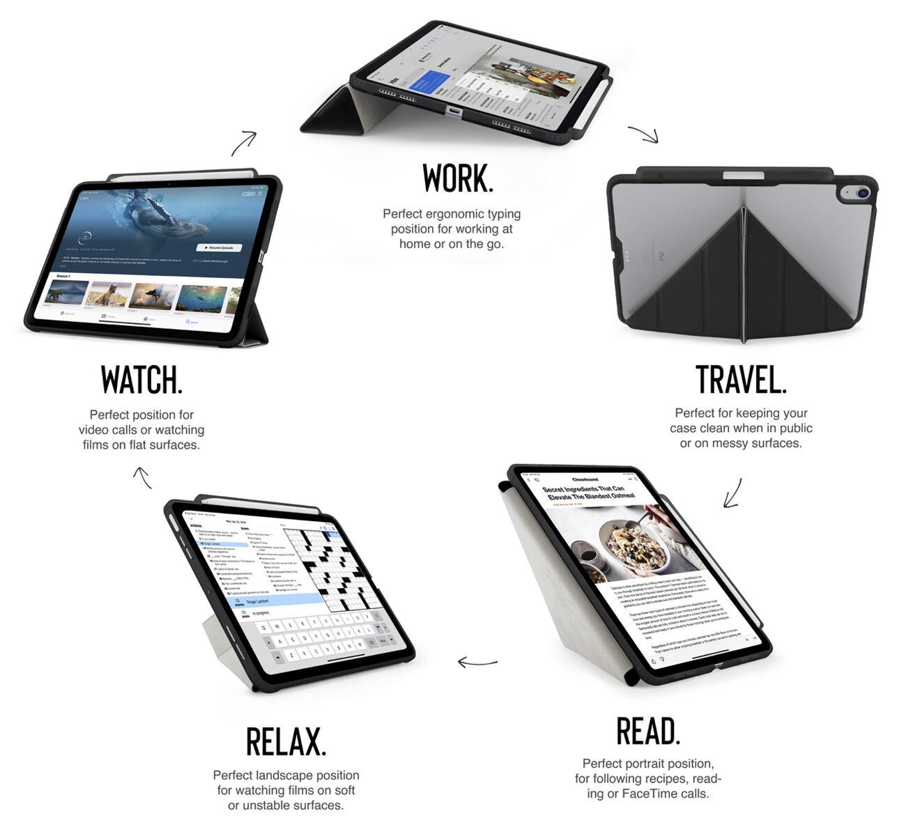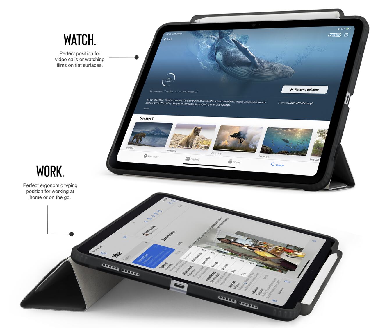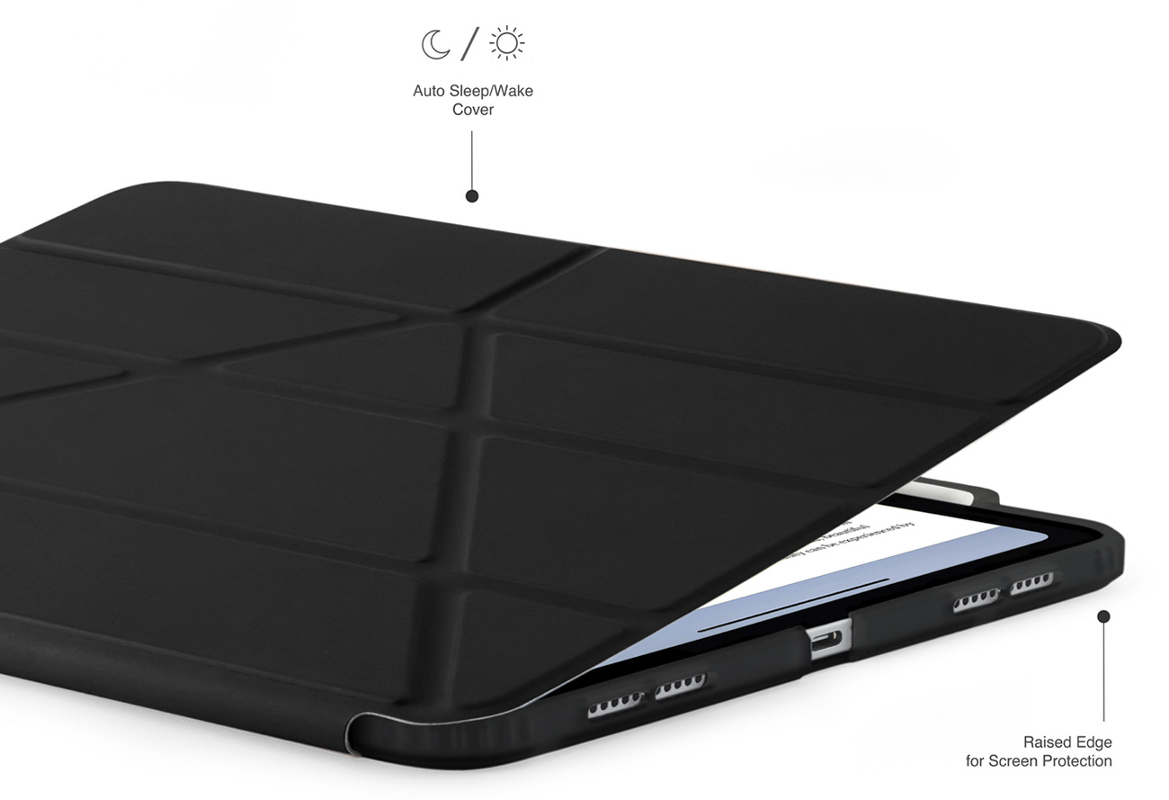 من خلال تشكيل الغطاء الامامي .. يمكن تثبيت الايباد بالطول او بالعرض وبعدة زوايا تناسب استخدامكم.