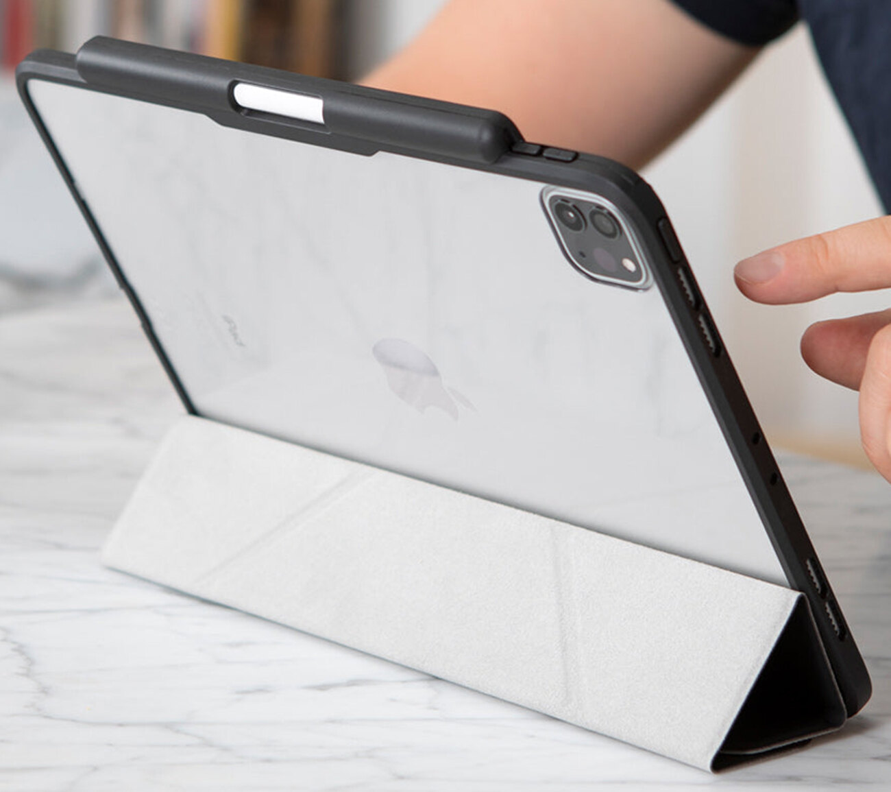 يحتوي على مكان لحفظ قلم ابل .. بالتالي يمنع ضياعه.