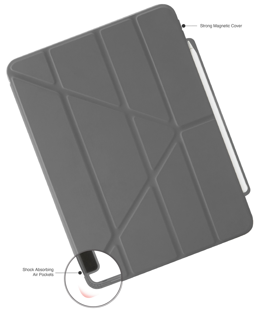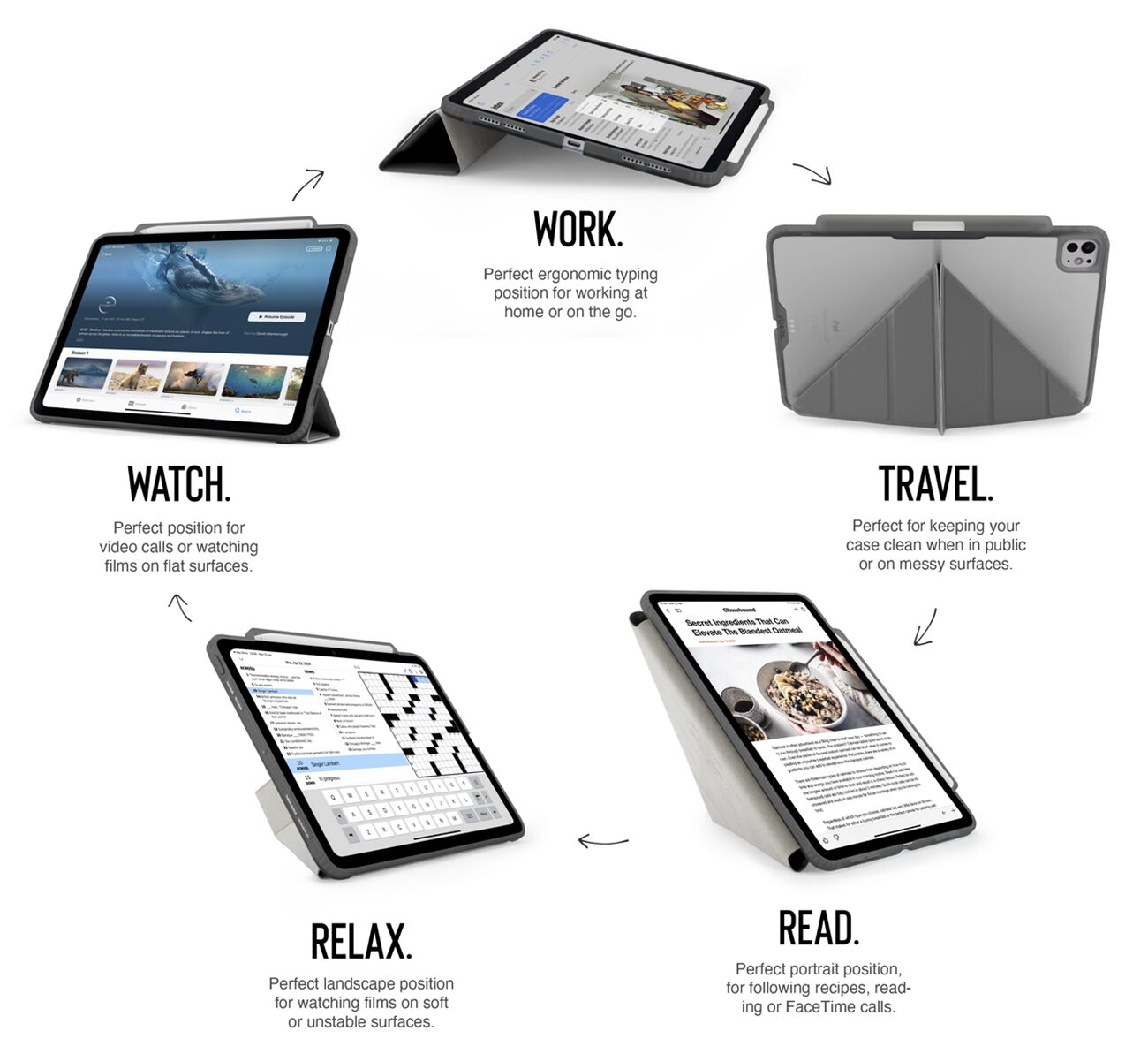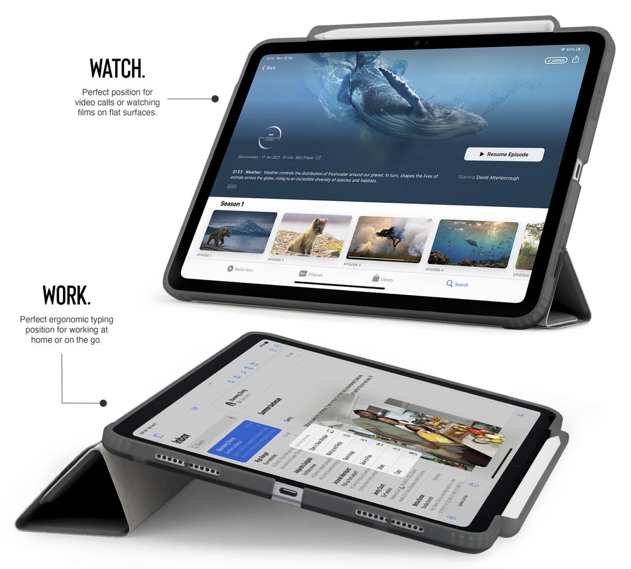 من خلال تشكيل الغطاء الامامي .. يمكن تثبيت الايباد بالطول او بالعرض وبعدة زوايا تناسب استخدامكم.