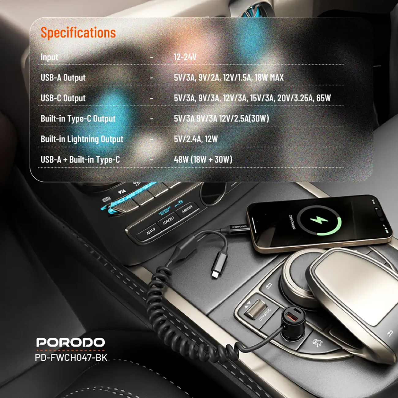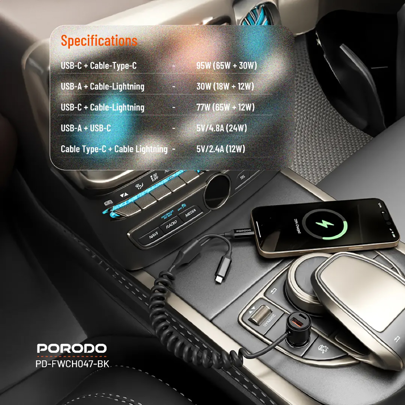 شاحن سيارة من بورودو / مدخلين تايب سي + مدخلين USB-A / قوة 102 واط / مع توزيع ذكي للطاقة