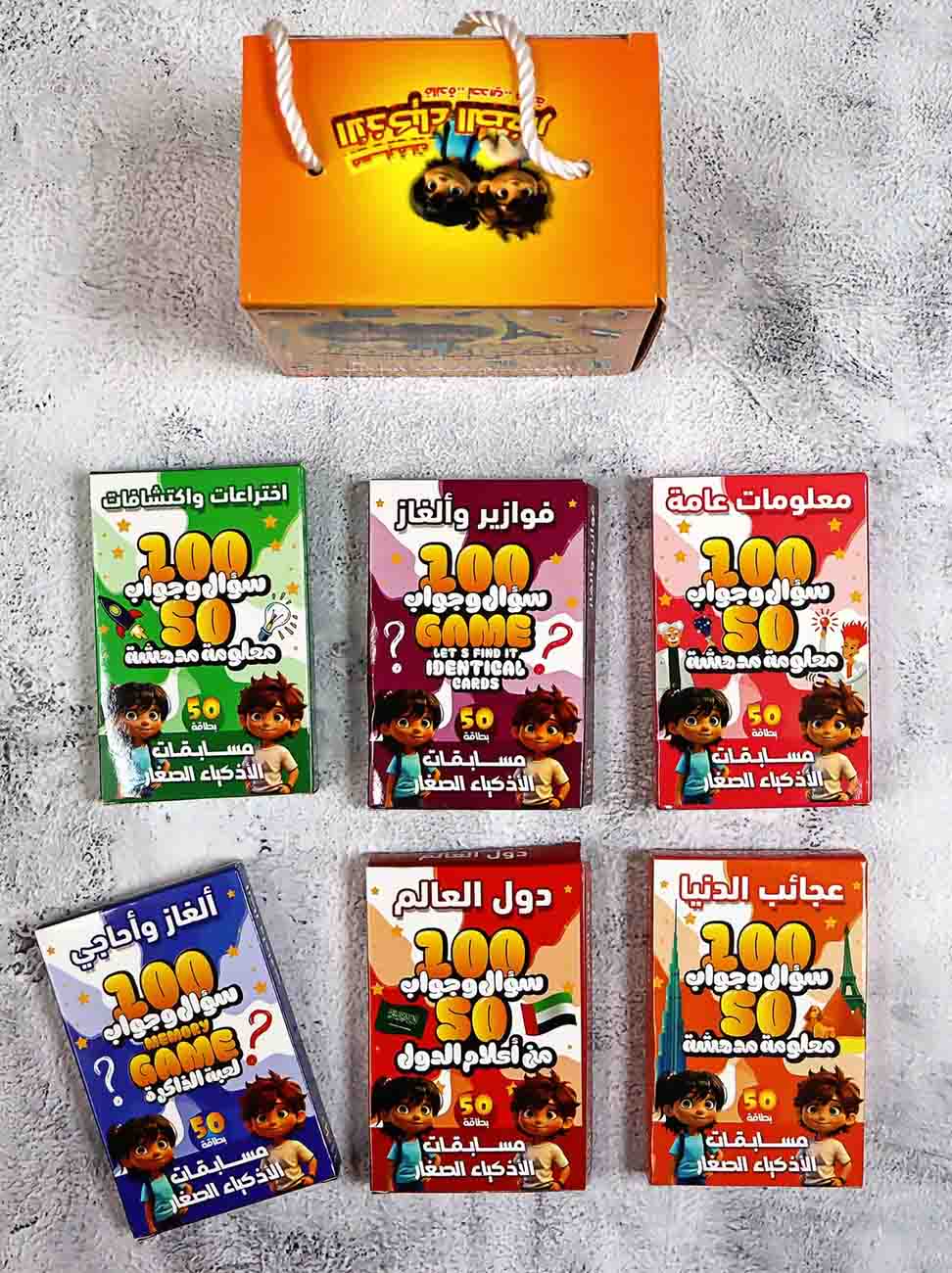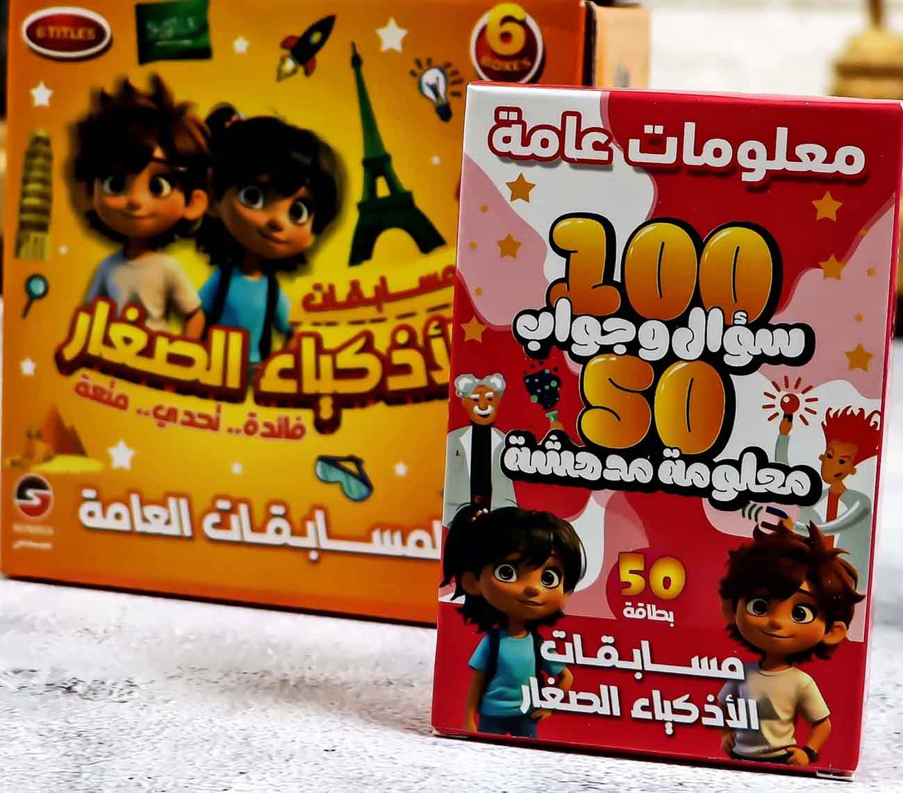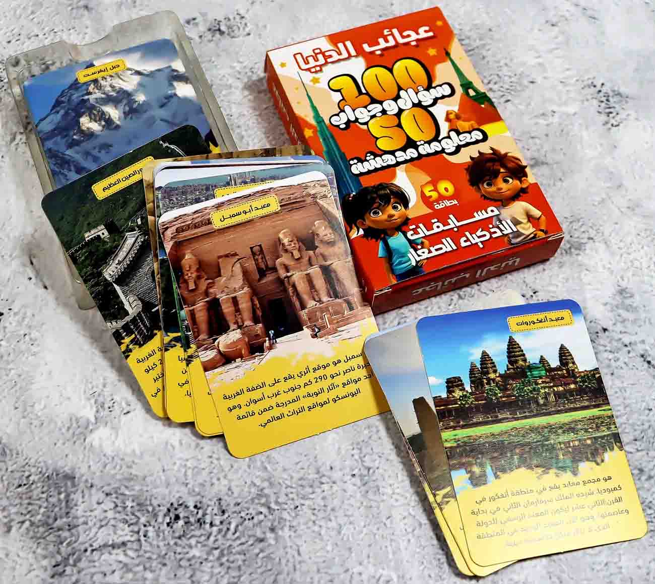 كل علبة فيها 50 بطاقة .. وكل بطاقة فيها سؤال وجواب من جهة وصورة ومعلومة مبسطة من الجهة الأخرى.