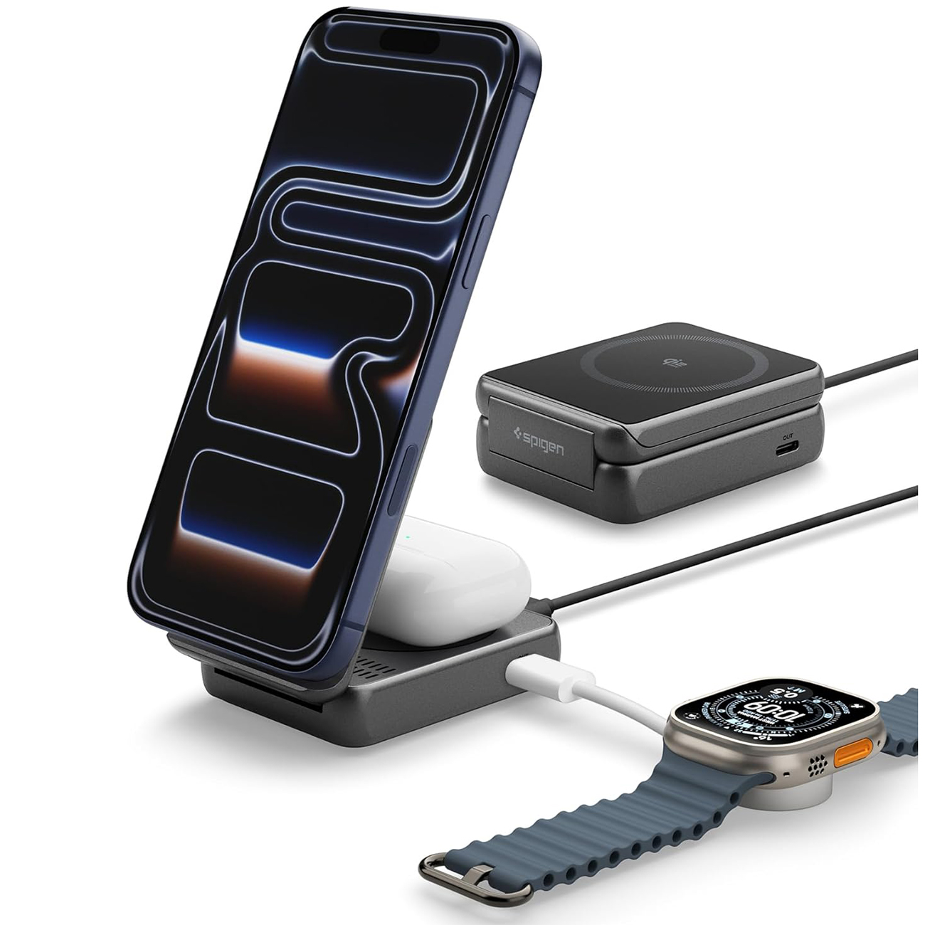 ستاند و شاحن من Energea / يشحن الجوال + الساعة + الايربودز / يدعم MagSafe / لون Gunmetal