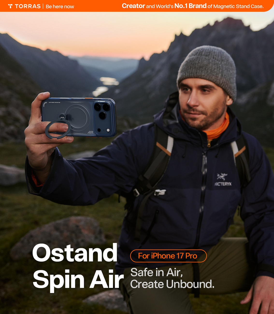 كفر Torras Ostand Spin لايفون 17 برو / يدعم MagSafe / مع مسكة مدمجة / ضد الطيحات / شفاف