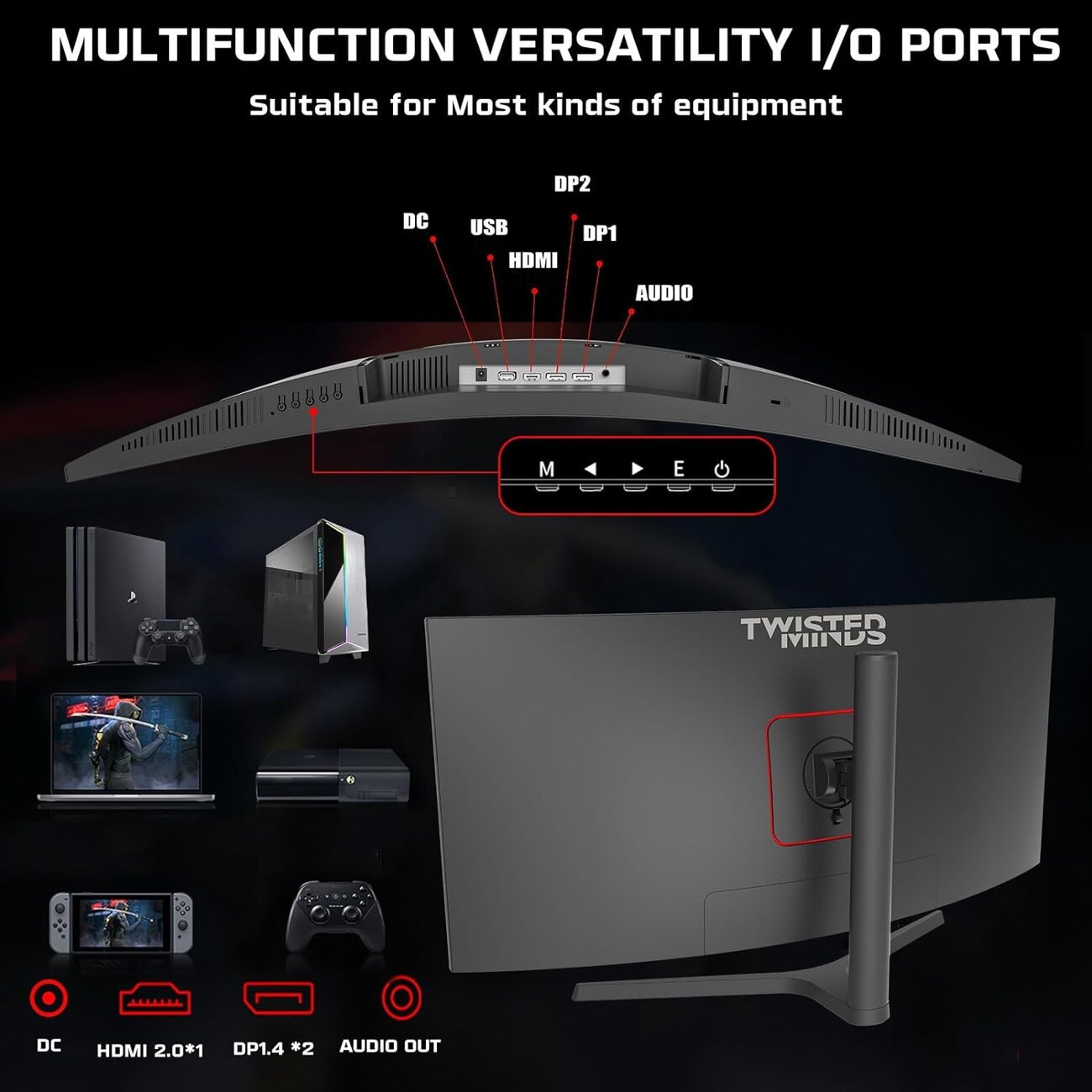 خيارات توصيل متعددة: مدخل DC .. مدخل USB .. مدخل HDMI .. مدخل صوت .. مع مدخلين DP.