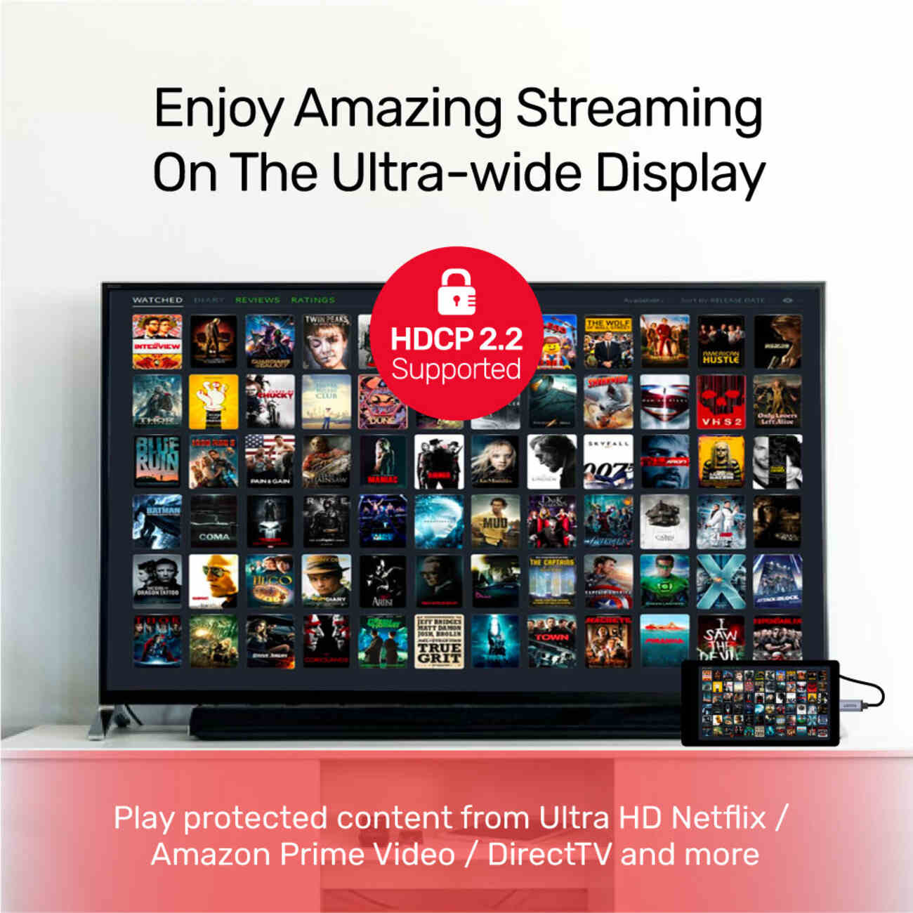 يدعم معيار HDCP2.2 اللي يسمح بتشغيل تطبيقات المسلسلات والافلام مثل نيتفليكس وأمازون برايم مع دقة 4K.