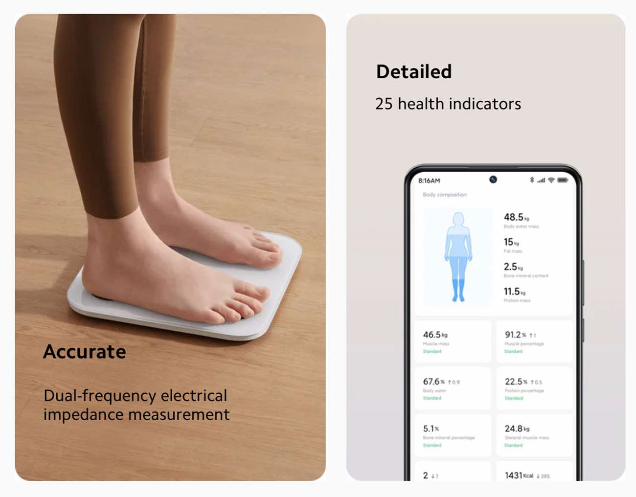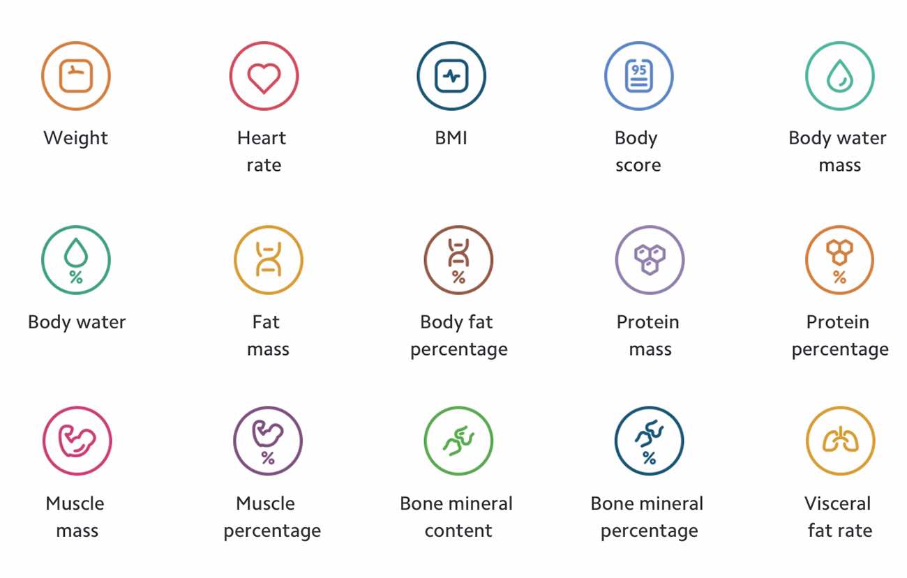 يعطيك 25 قياس مختلف مثل: الوزن .. معدل نبضات القلب .. نسبة الماء في الجسم .. معدل البروتين .. نسبة الدهون في الجسم .. كتلة العضلات وغيره.