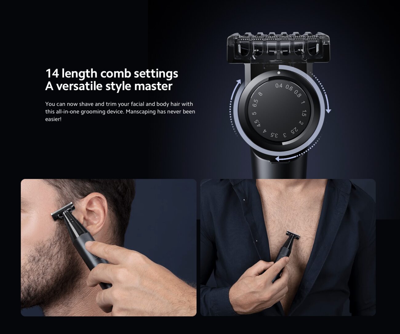 هناك 14 اعداد للطول لتقليم شعر الوجه والجسم.