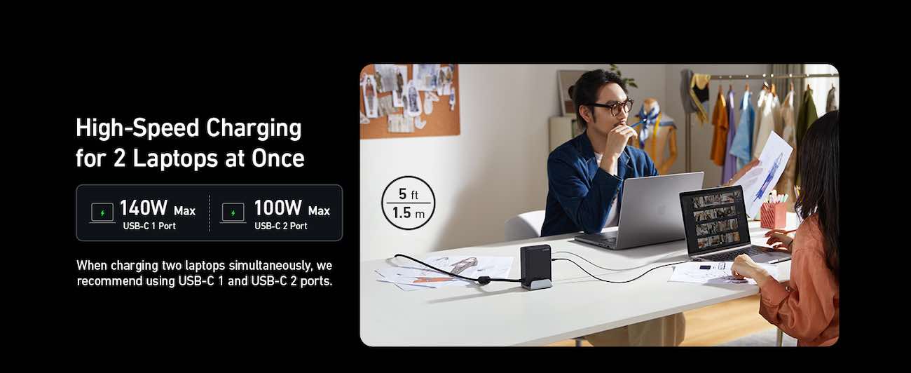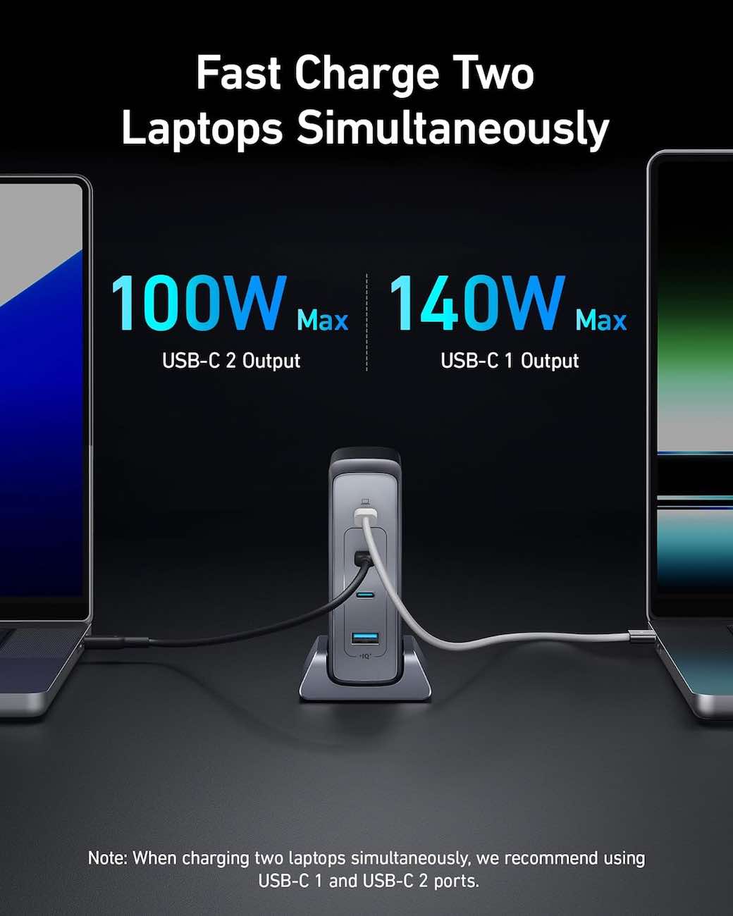 Charges two regular laptops simultaneously, and each laptop charges at maximum speed.
