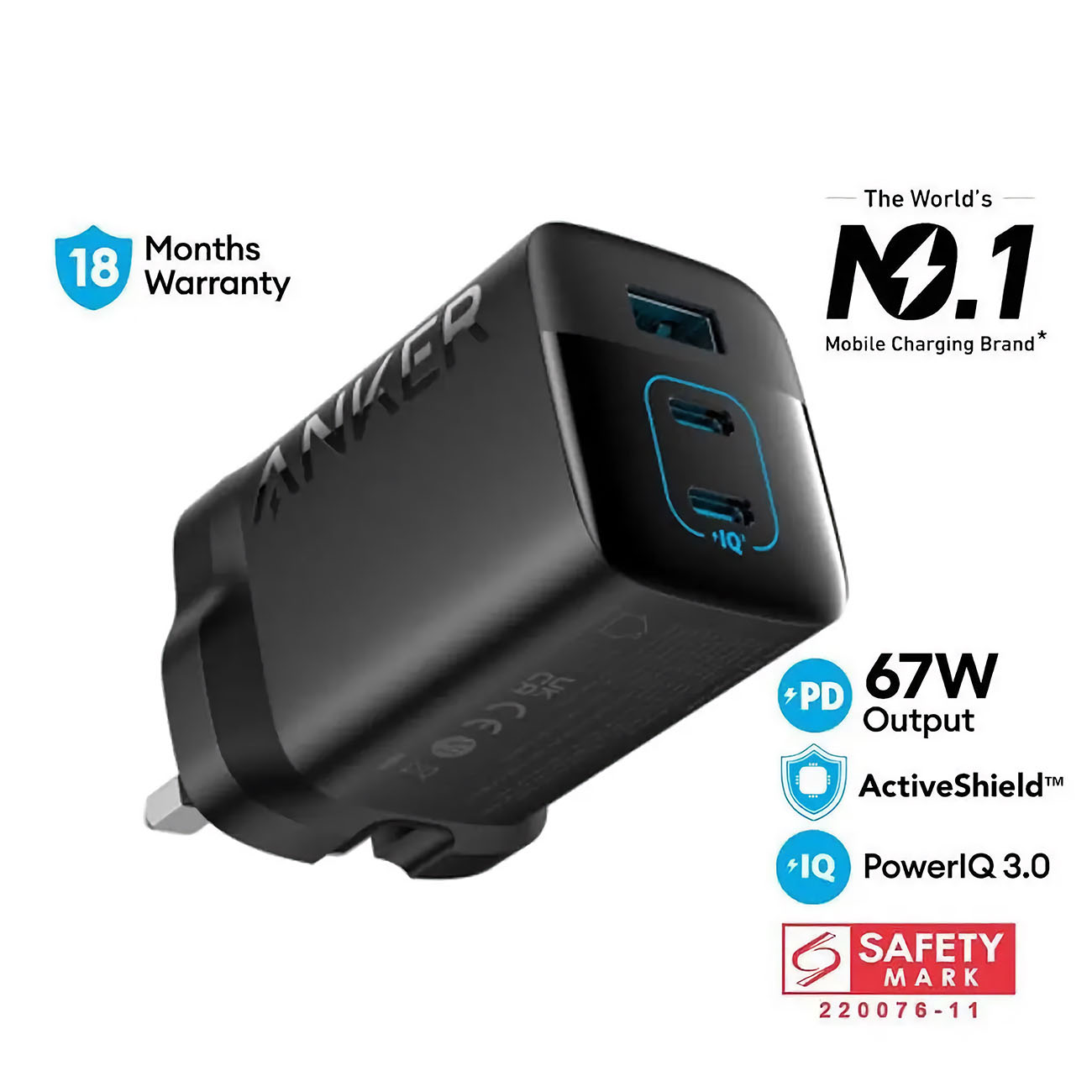 Anker GaN Charger / 65W Power / 2 Type-C Ports & 1 USB-A Port / Black