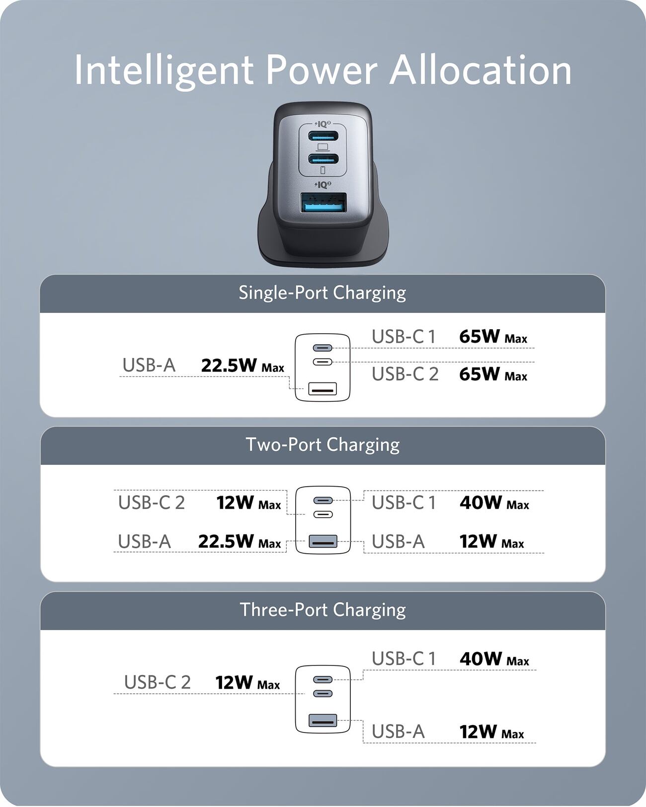 Charge Up to 3 Devices Simultaneously: When you connect 3 devices, the top USB-C port can output 40W, the second USB-C port can output 12W, and the USB-A port can also output 12W. That gives you the power you need to charge your notebook, your tablet, and your phone all at the same time.