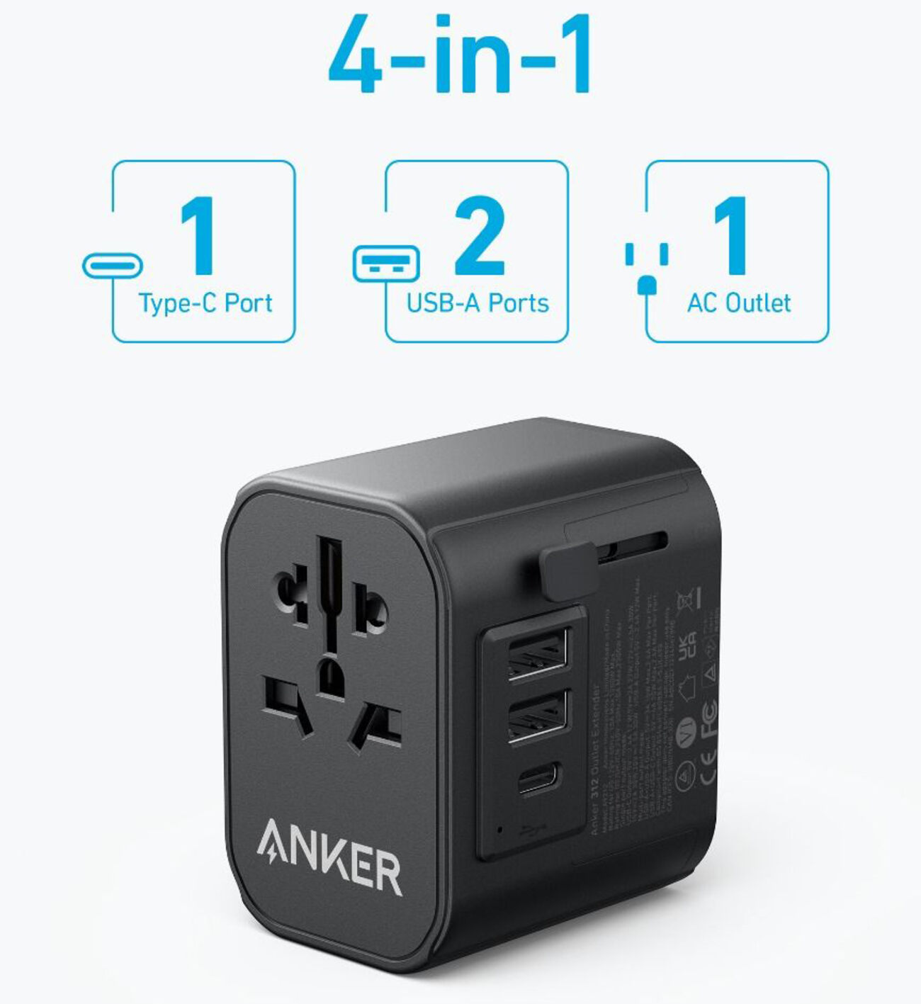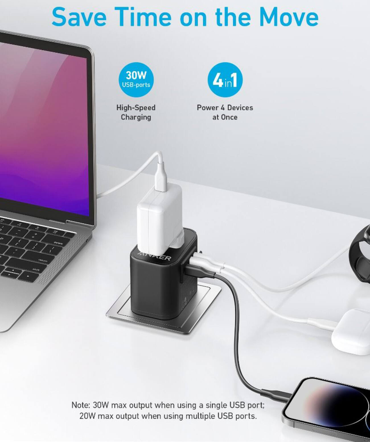 4-in-1: Equipped with 1 AC outlet, 2 USB ports, and a 30W max USB-C port to simultaneously power up to 4 devices.