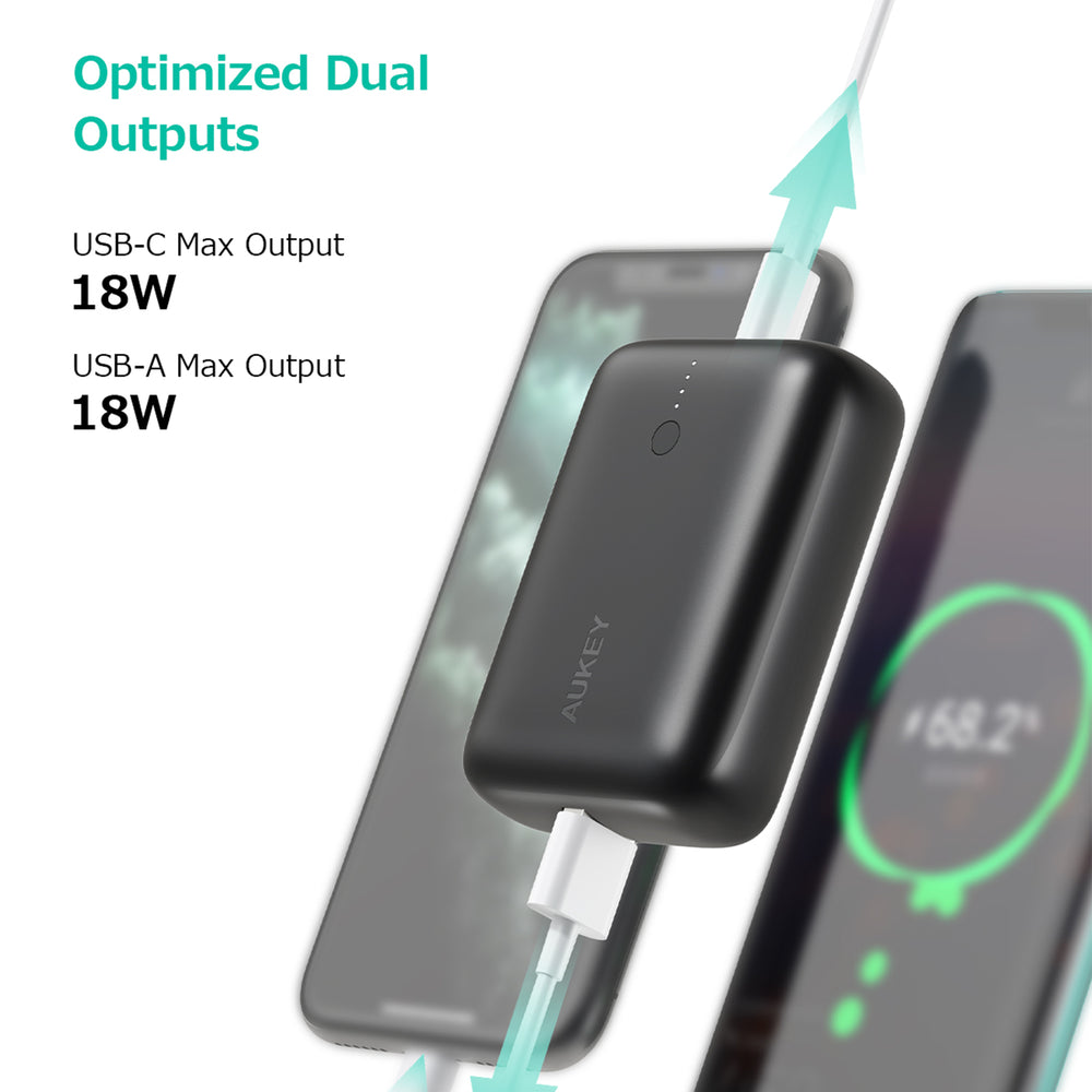 - Optimized dual USB Ports USB-C Max Output/Input 18W and USB-A Max Output 20W. Dual Outputs allow you to charge two devices simultaneously, and it can also supports pass-through charging and recharge the power bank
