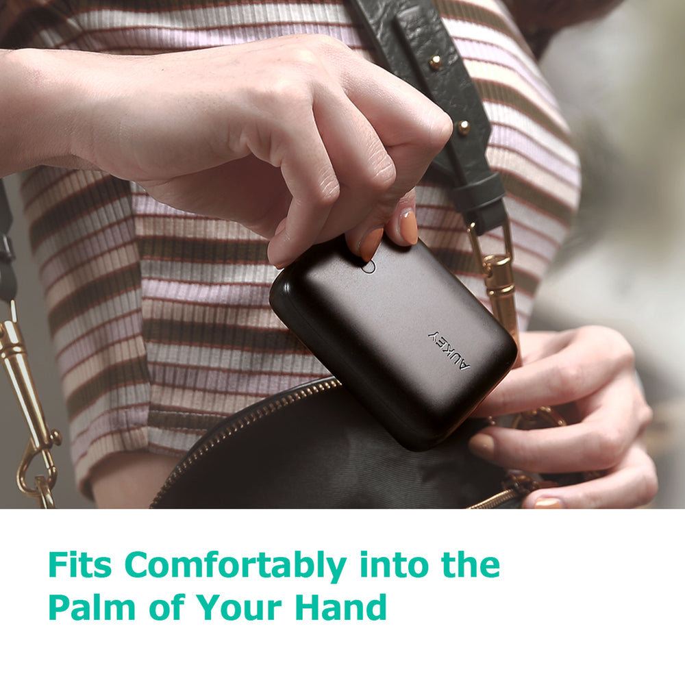 - Delicate design One of the smallest and lightest 10,000mAh portable charger. It’s compact and smooth design fits comfortably into the palm of your hand and the minimalist LED indicator shows the remaining power at a glance