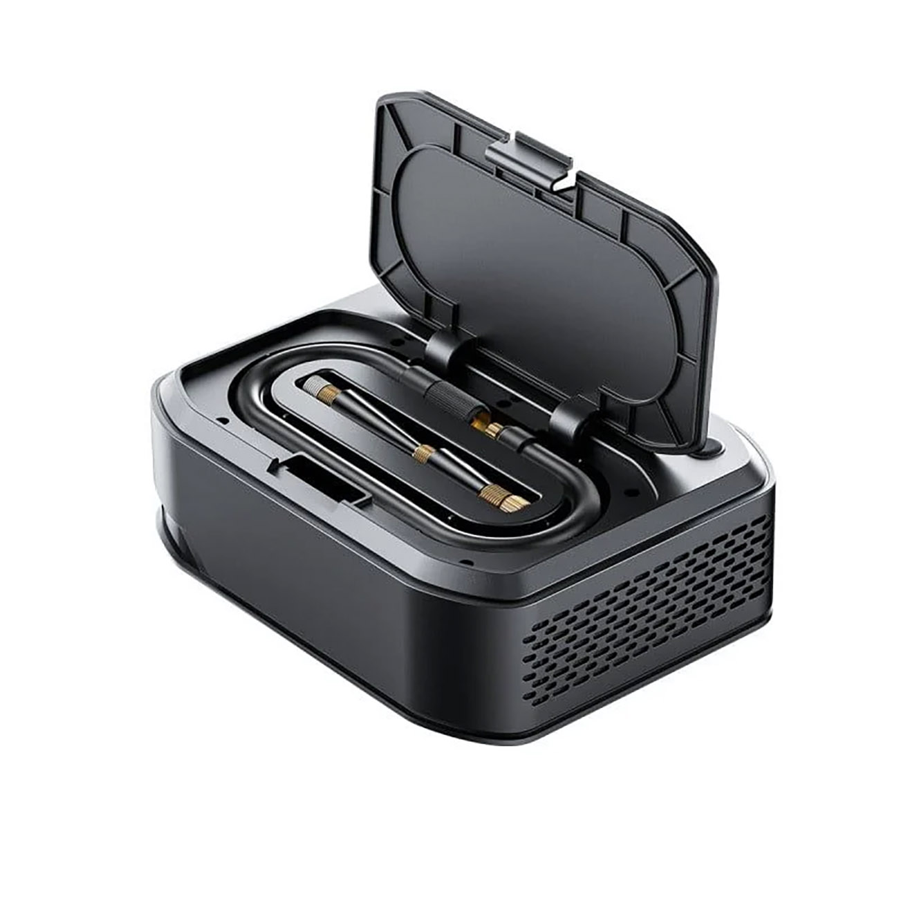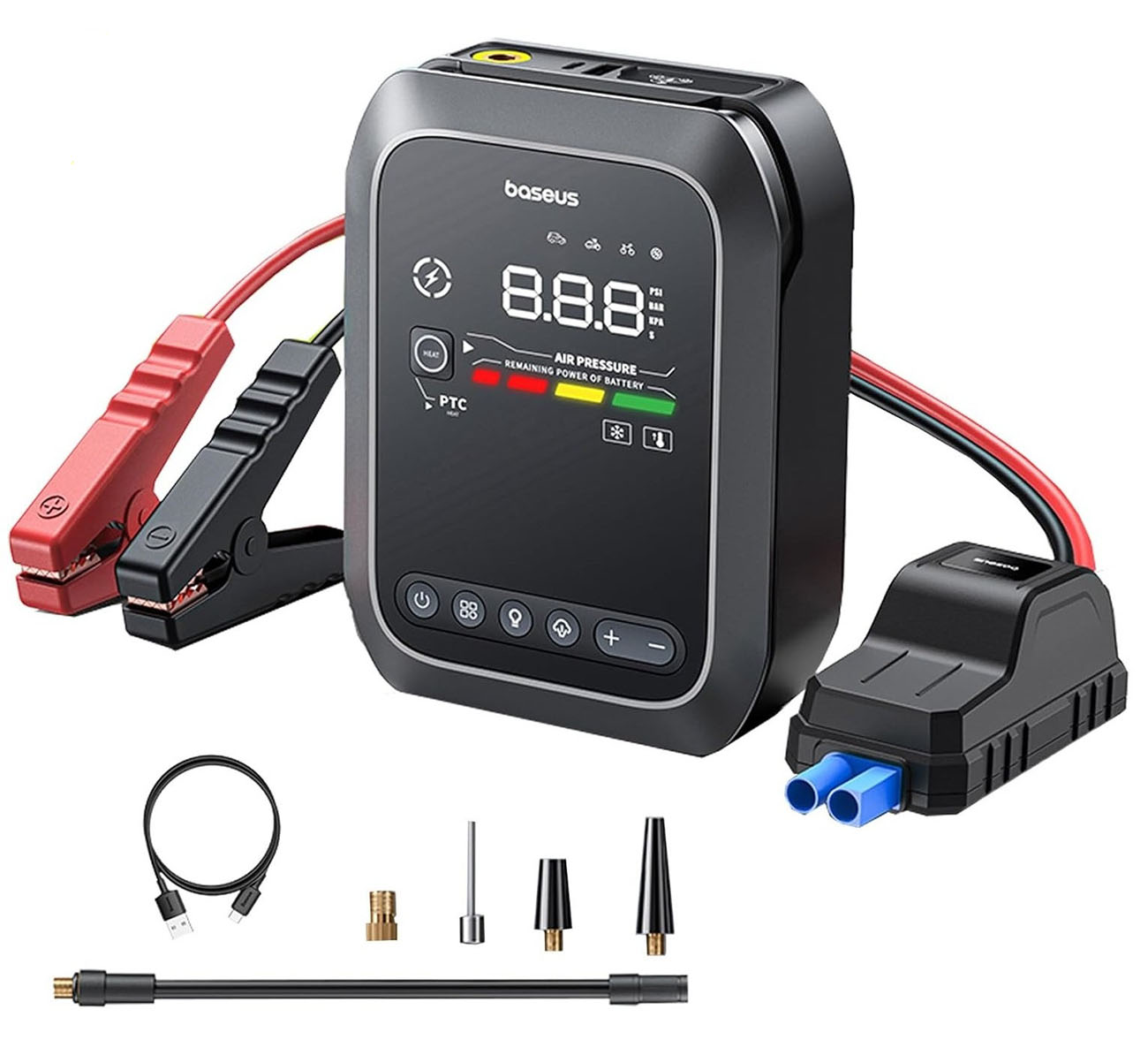 4-in-1 design: Jump starter .. tire inflator .. power bank .. and LED flashlight.
