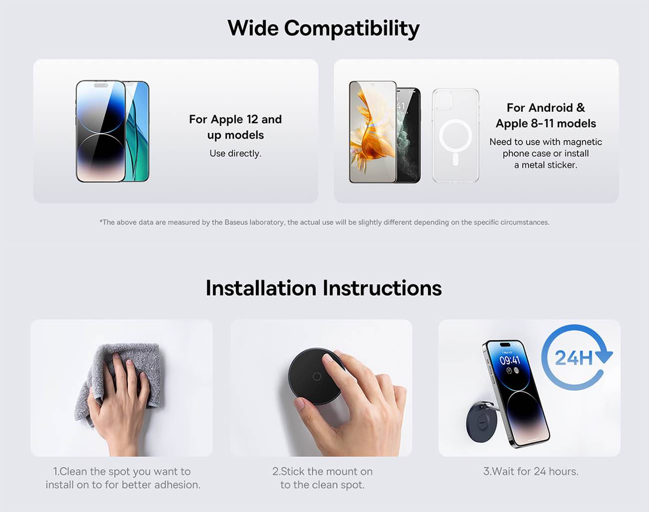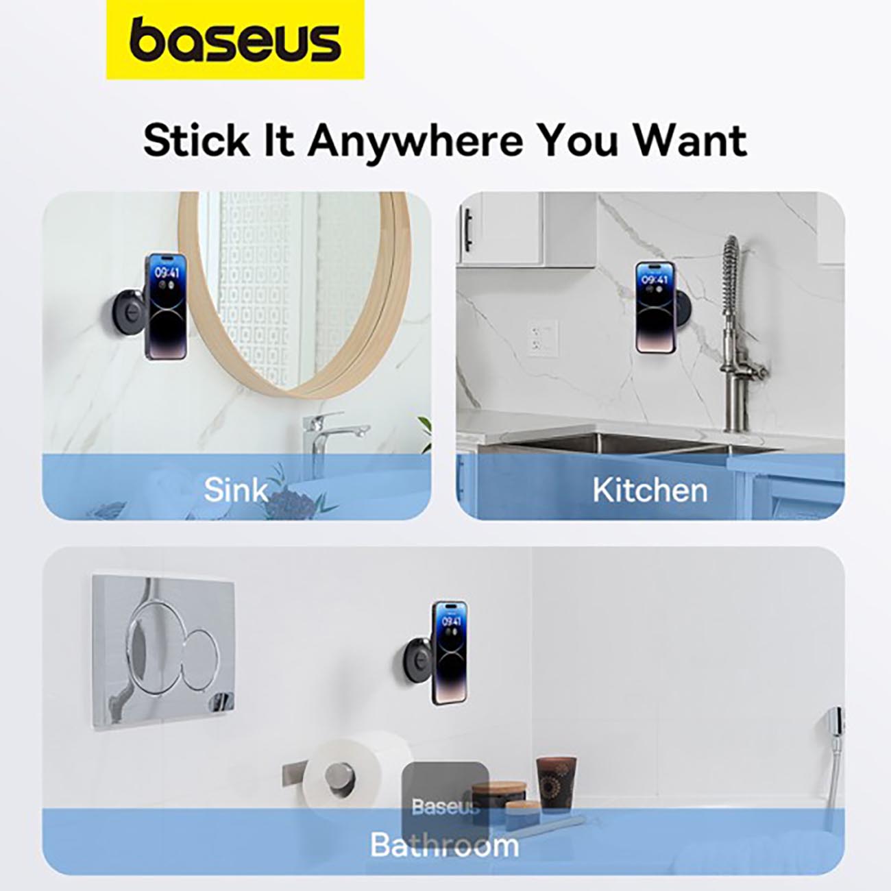 Stand base has adhesive … lets you mount it on different surfaces like glass, marble, wood, metal, and tile.