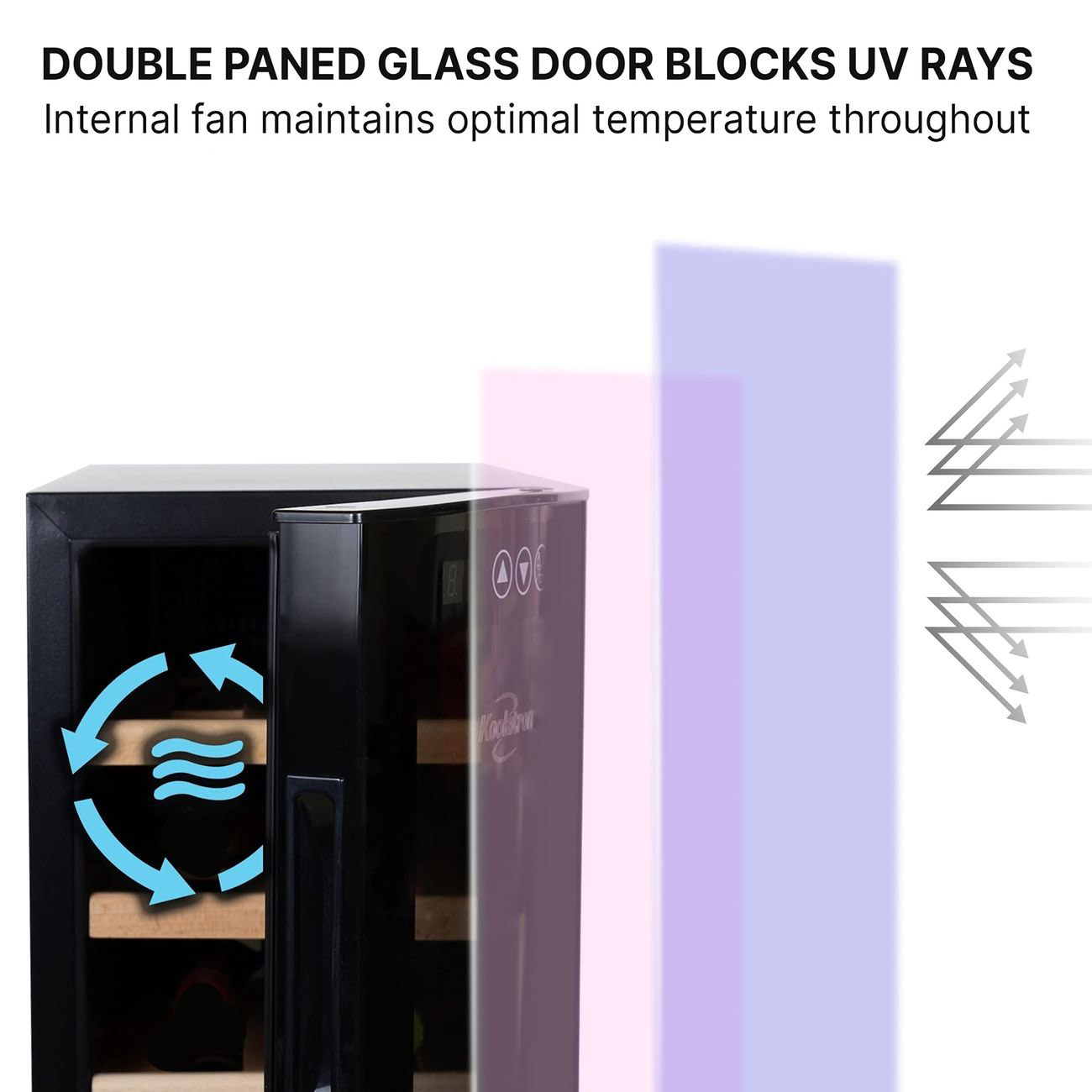 This fridge has a 35L capacity — enough to fit 12 large juice bottles (Vimto size) or many smaller bottles.