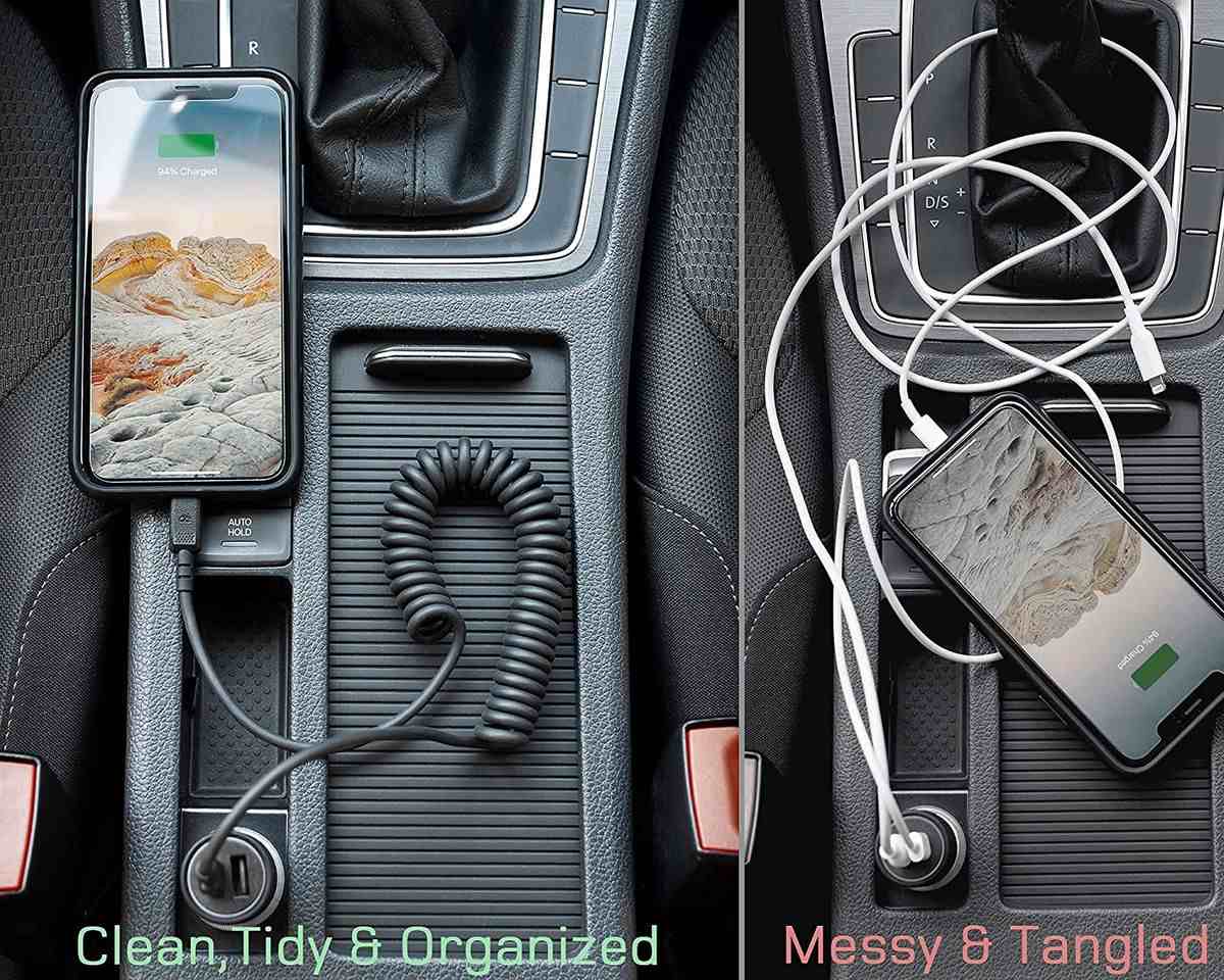 Coiled = Tidy + Neat + Organized / de Coiled iPhone Cable (USB C to Lightning Cable), perfect solution to stay neat, organized, and keep cords out of the way for your car. Easy to store away, expands to the length when needed. No more silly long wires, no dangling mess, no twisted cables.