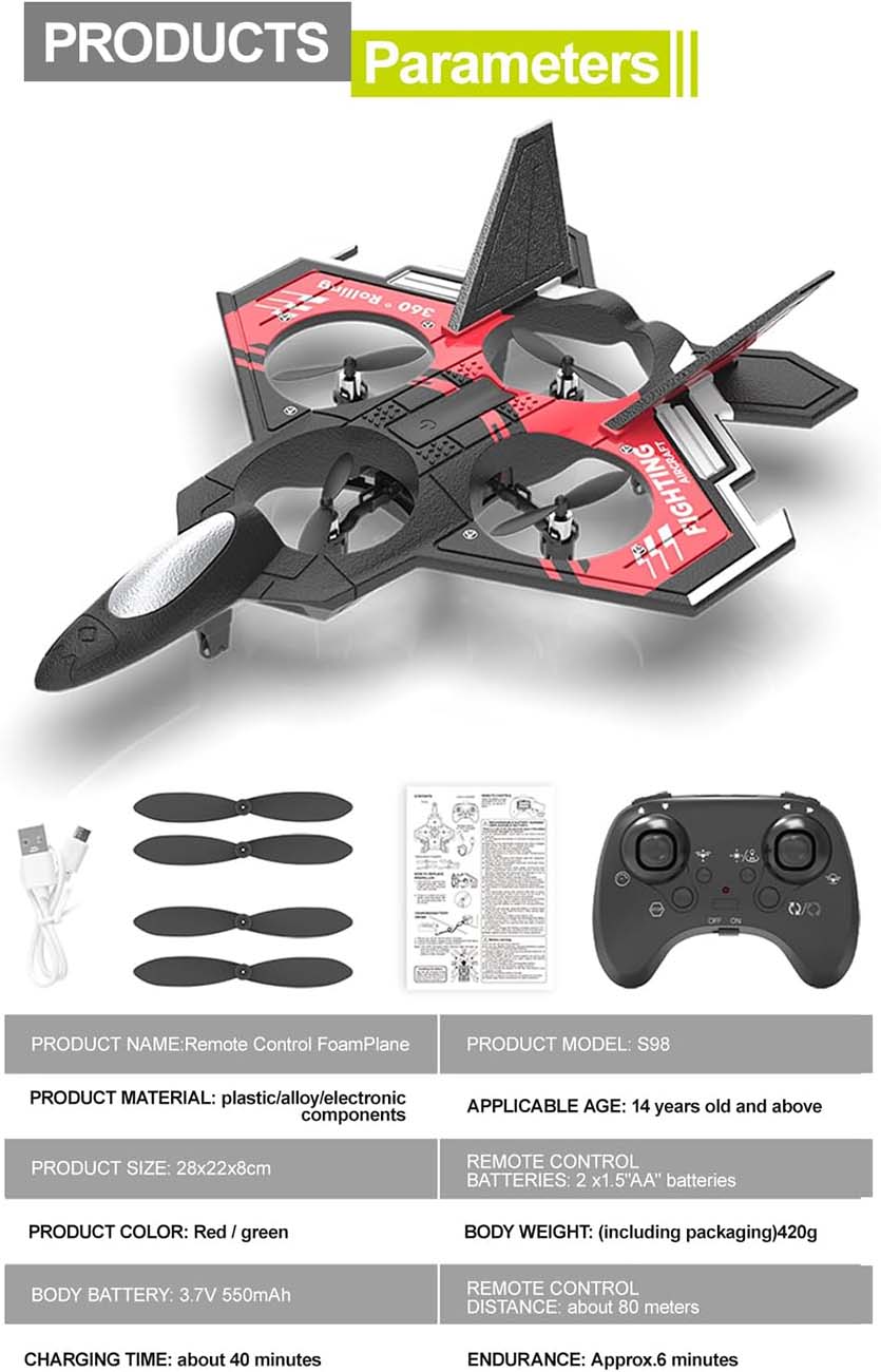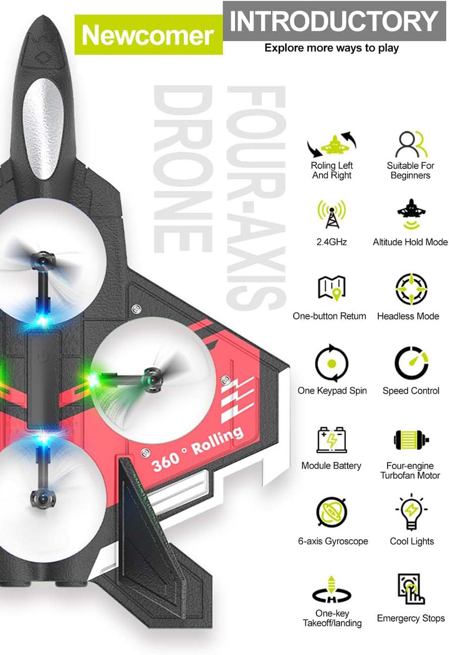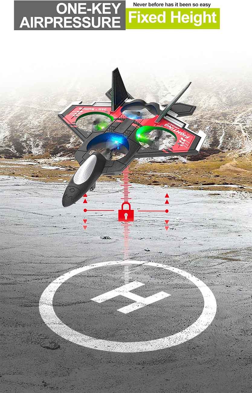 Offers 3 flight speeds with stunt moves and automatic flight modes.