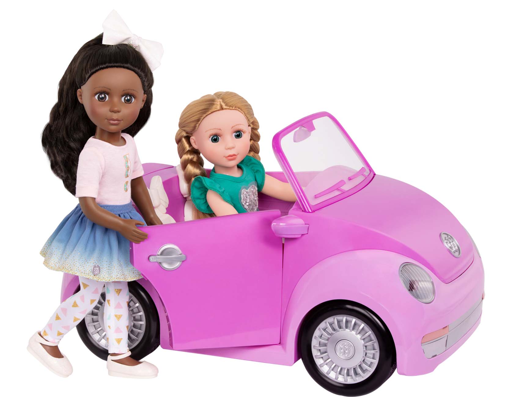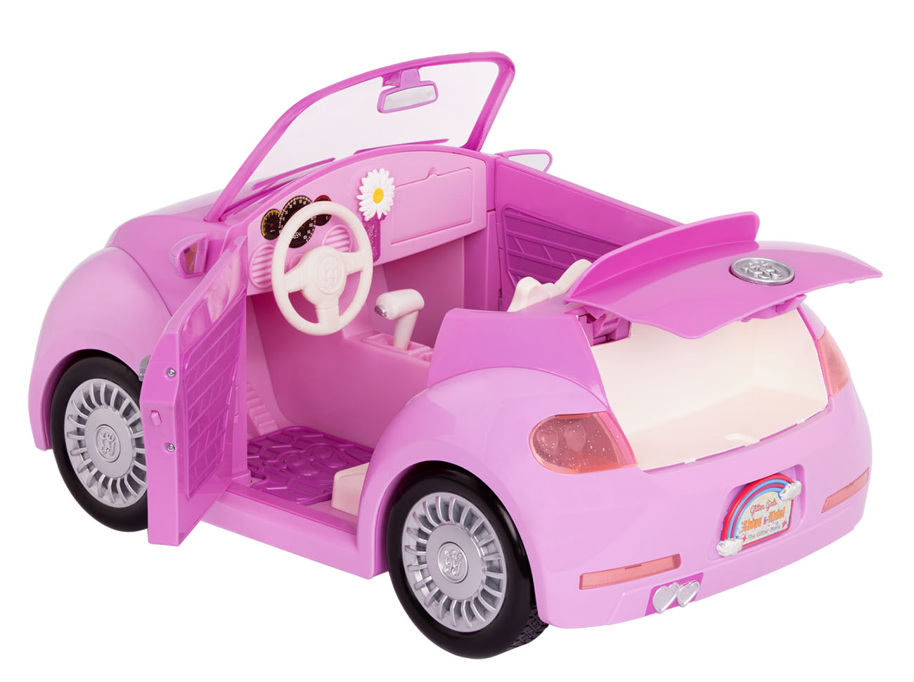 Includes a rear trunk that opens and interior storage compartments for carrying doll travel essentials.