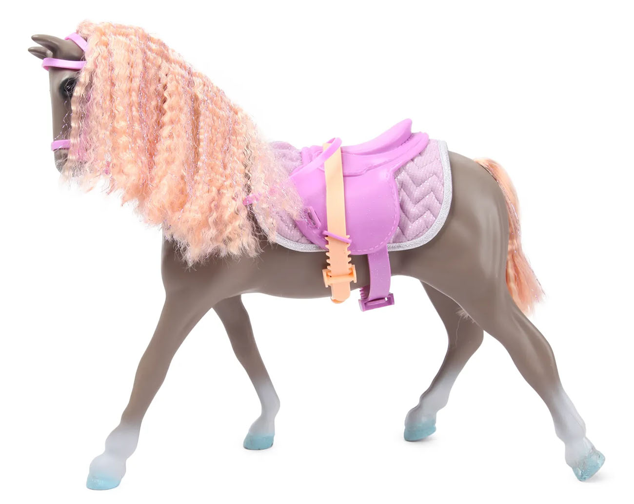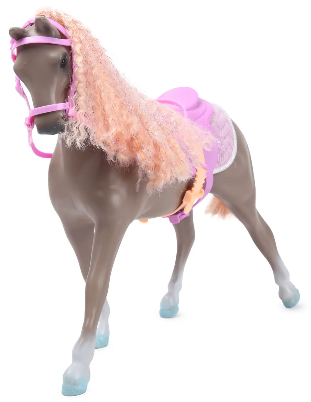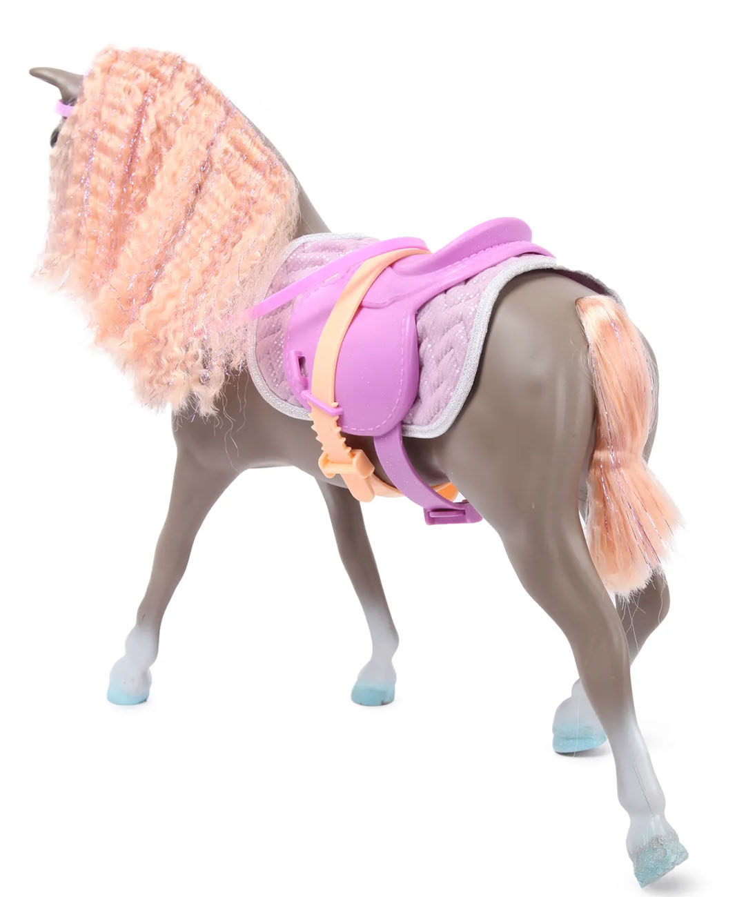 Includes a set of stylish accessories such as a golden tiara .. pink saddle .. hairbrush .. and more.