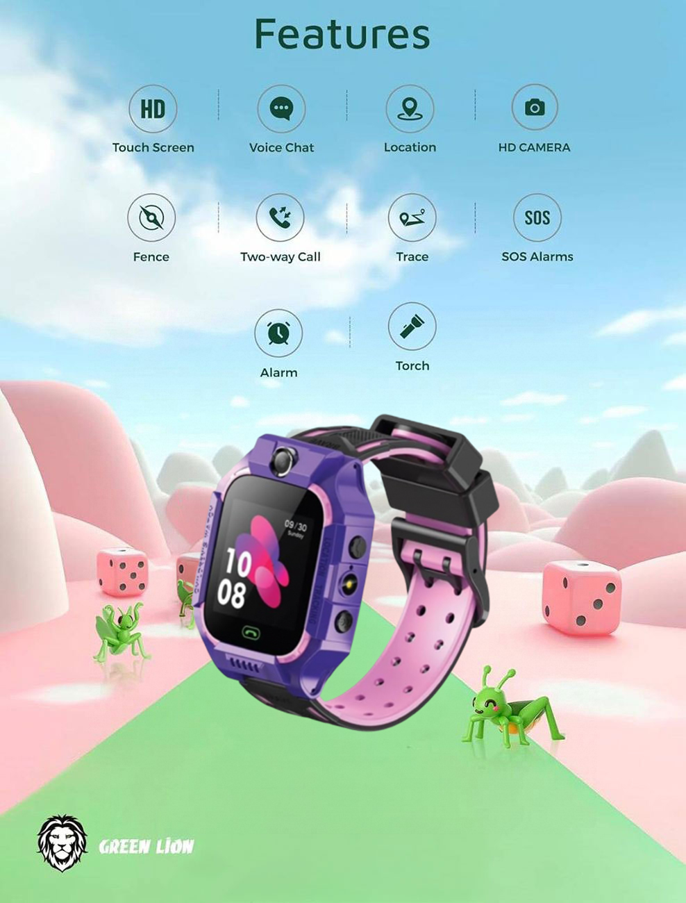Green Kids Smart Watch / Size 1.85 inch / Water Resistant / HD Camera / Supports GPS / Pink