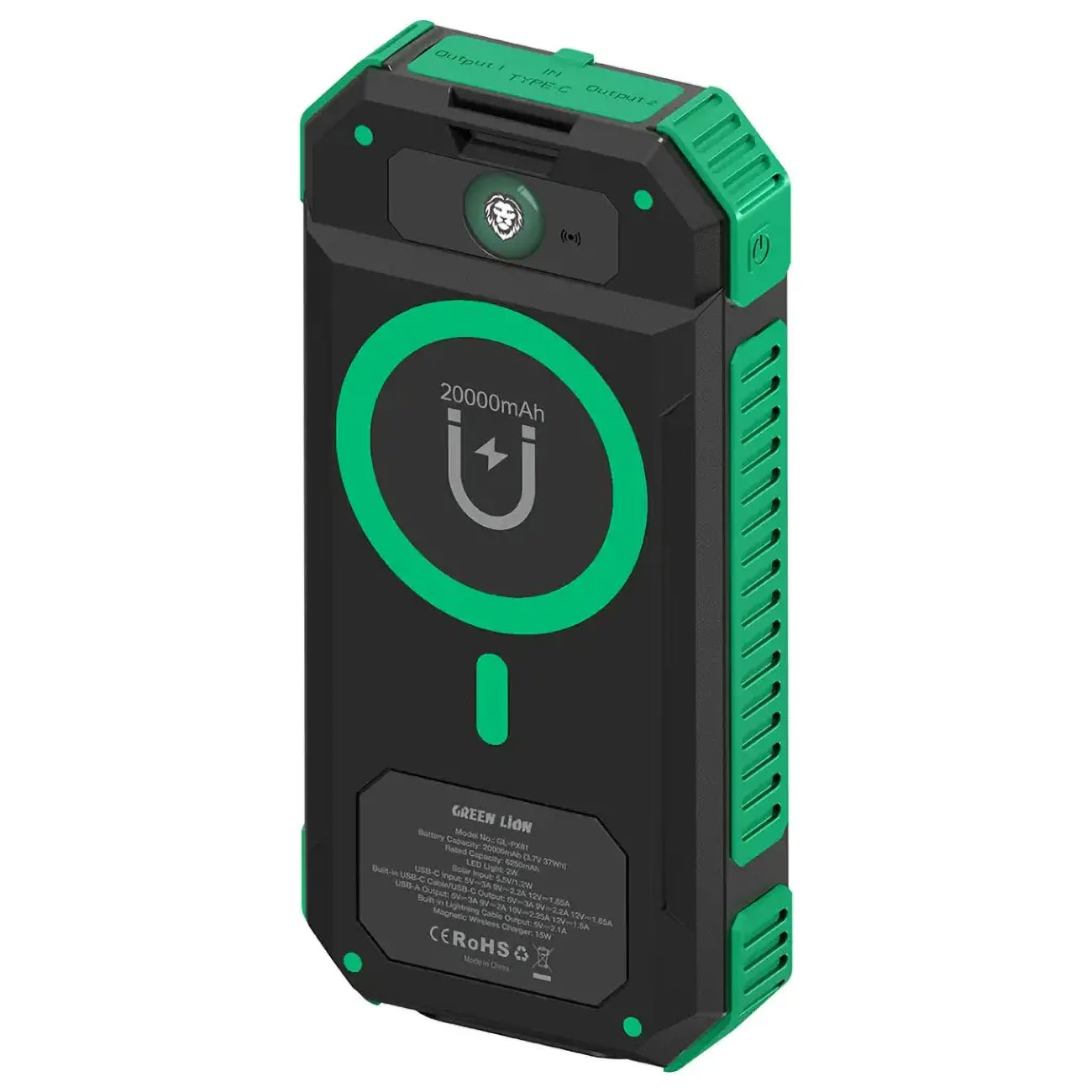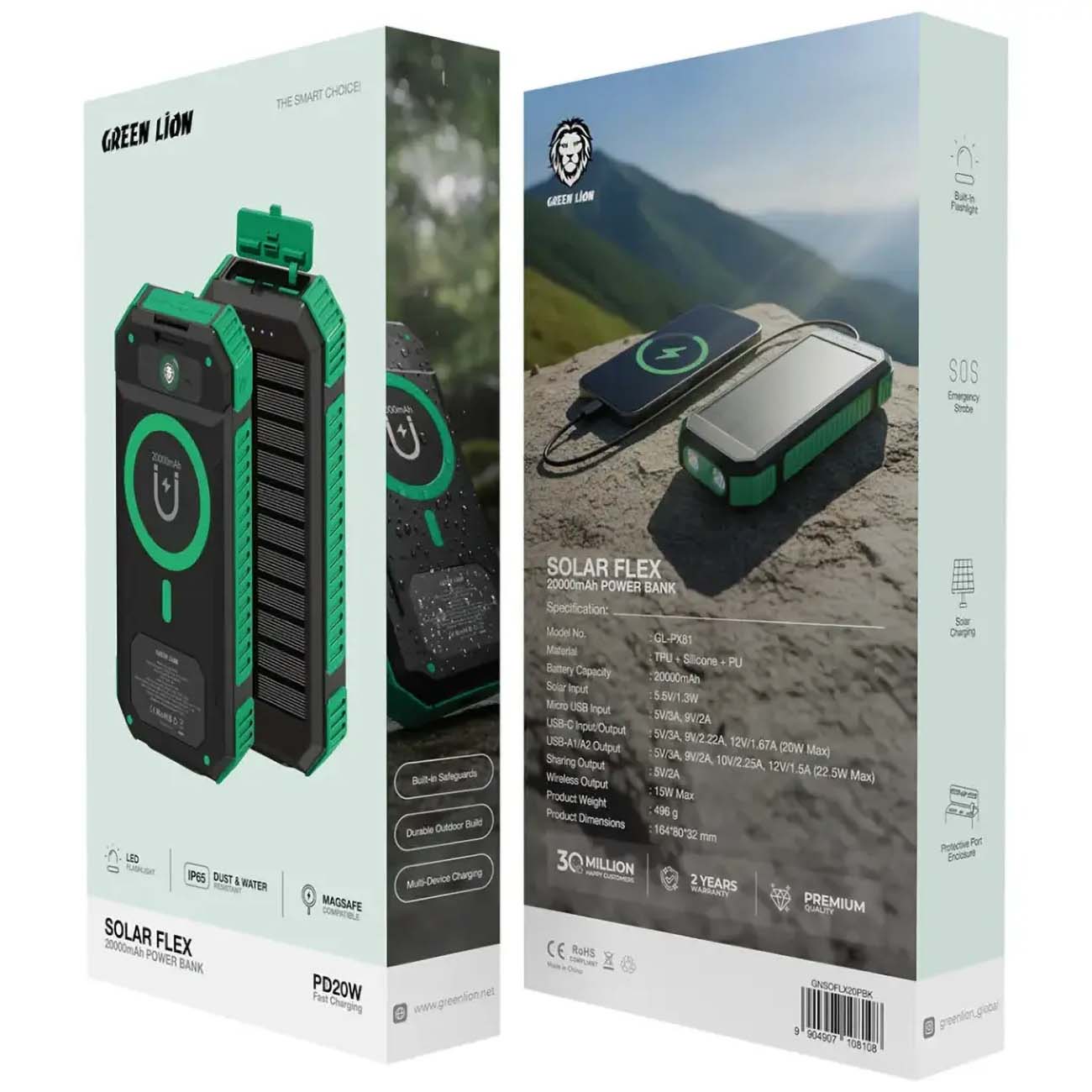 Green 20,000mAh Power Bank / Supports Solar Charging / 3 Ports + 3 Built-in Cables / Built-in Light