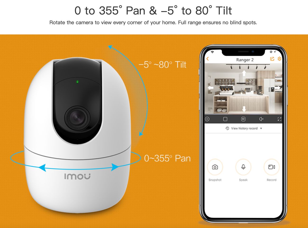 - 0~355° Pan & -5°~80° Tilt Rotate the camera to view every corner of your home. Full range ensures no blind spots.
