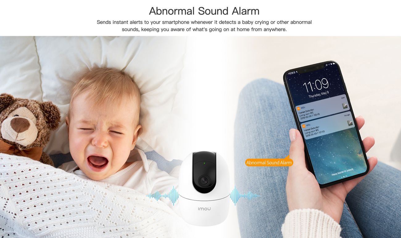 - Abnormal Sound Alarm Sends instant alerts to your smartphone whenever it detects baby’s crying or other abnormal sound,keeping you aware of what’s going on at home from anywhere.